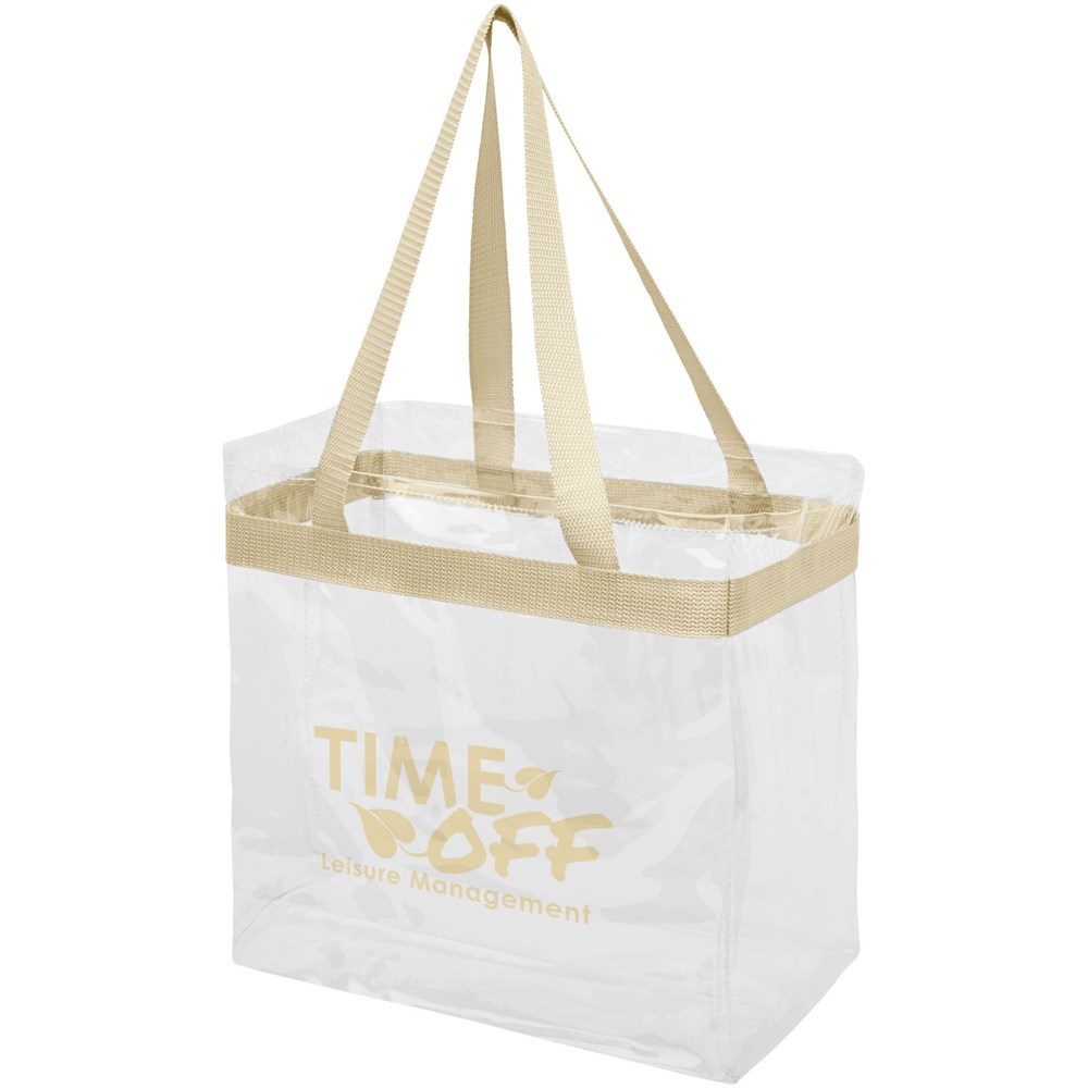 Transparante draagtas, perfect voor een middag in het stadion, een dagje op een festival of gewoon voor werk of school. Open hoofdvak met sportieve gaasrand en dubbele hengsels. Draaghoogte 27 cm. Accessoires niet inbegrepen.