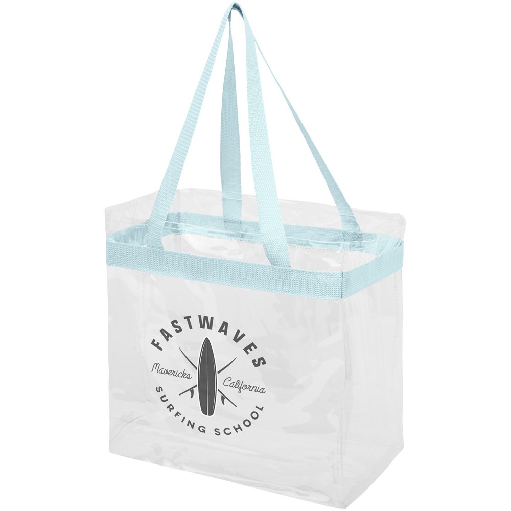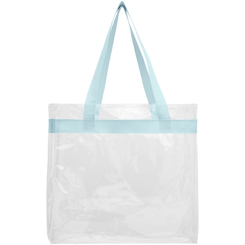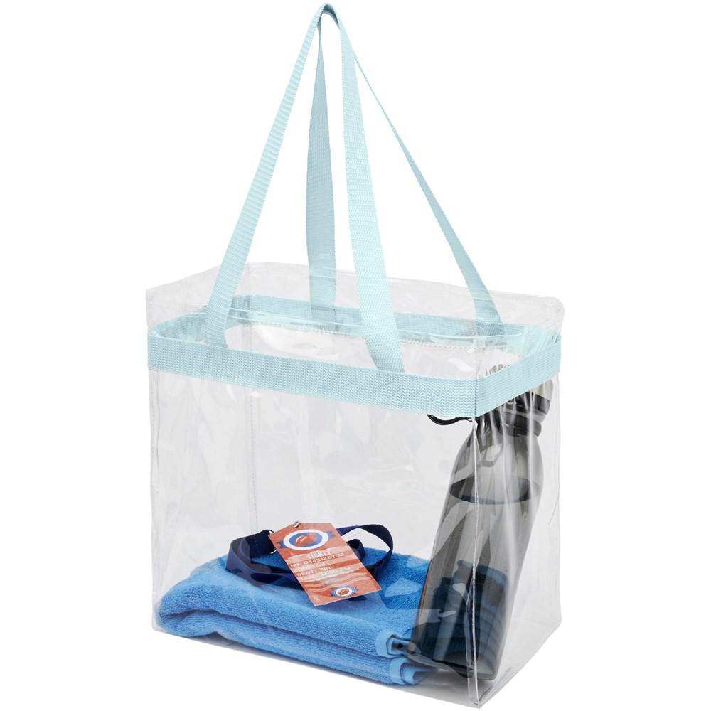 Transparante draagtas, perfect voor een middag in het stadion, een dagje op een festival of gewoon voor werk of school. Open hoofdvak met sportieve gaasrand en dubbele hengsels. Draaghoogte 27 cm. Accessoires niet inbegrepen.