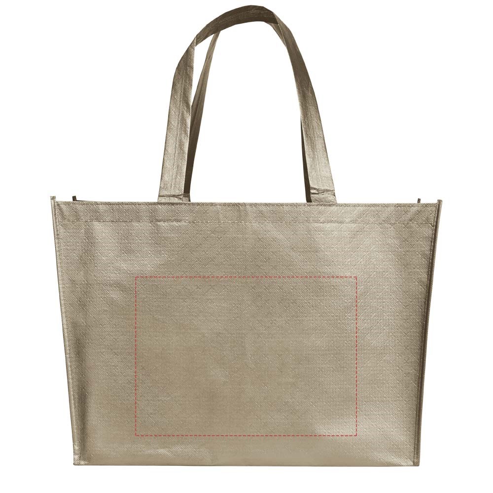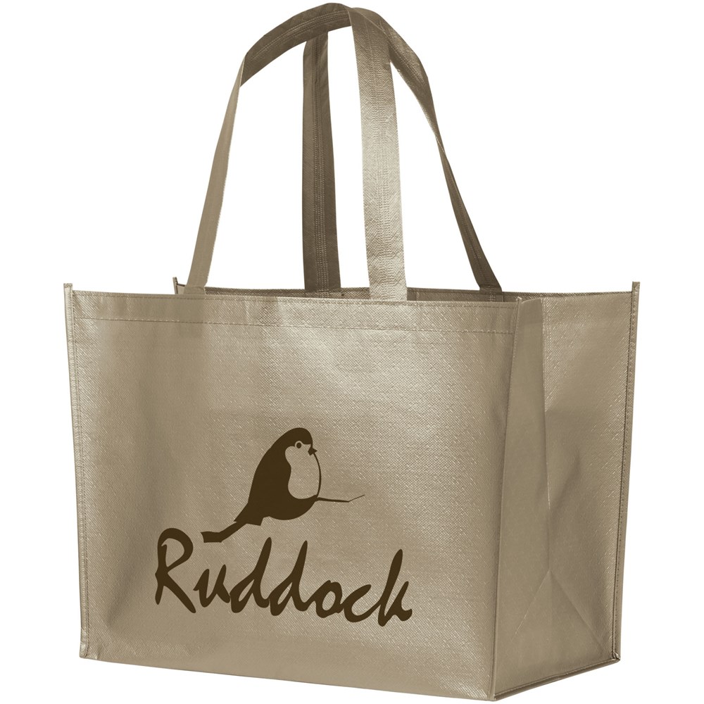 Een lichtgewicht, flexibele boodschappentas met een gelamineerde en glanzende metallic uitstraling. Gemaakt van 80 g gelamineerd, non woven polypropyleen.