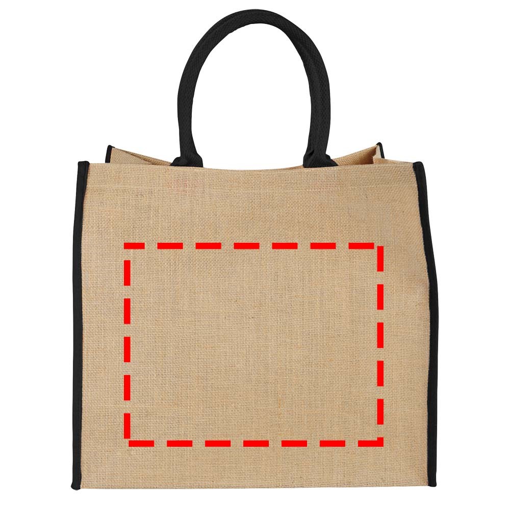 Jute tas met open hoofdvak. Klittenbandsluiting en dubbele handgrepen. Draaghoogte 17 cm. Geen kleine of gedetailleerde decoratie mogelijk.