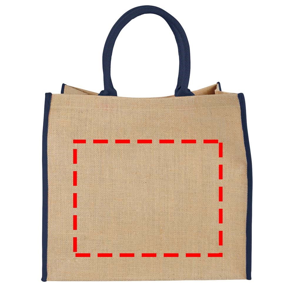 Jute tas met open hoofdvak. Klittenbandsluiting en dubbele handgrepen. Draaghoogte 17 cm. Geen kleine of gedetailleerde decoratie mogelijk.