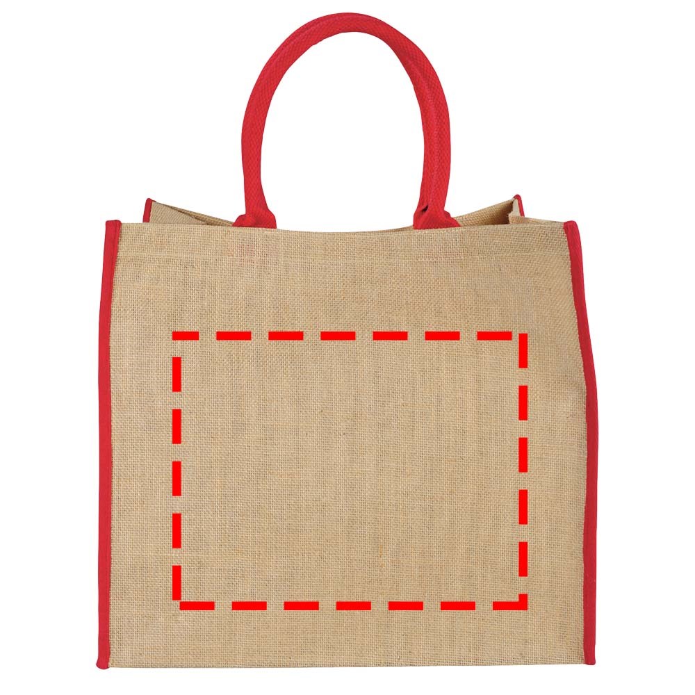 Jute tas met open hoofdvak. Klittenbandsluiting en dubbele handgrepen. Draaghoogte 17 cm. Geen kleine of gedetailleerde decoratie mogelijk.