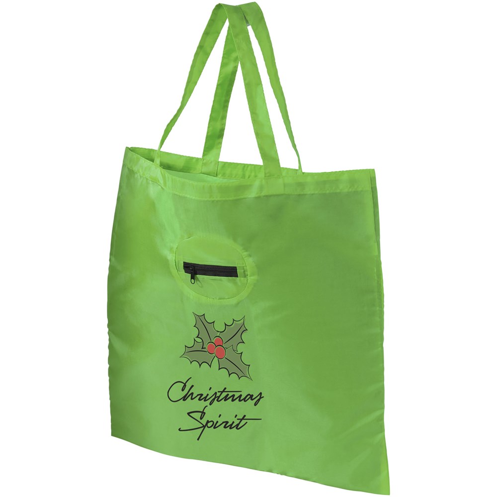 Opvouwbare polyester boodschappentas met een unieke manier van opvouwen. Pouch voorzien van rits en makkelijk te bevestigen aan een sleutelhanger. Herbruikbaar en is een geweldig alternatief voor plastic tassen. Draaghoogte 22cm. Opgevouwen maat: 11 x 8cm. Wordt uitgevouwen en plat verpakt geleverd.