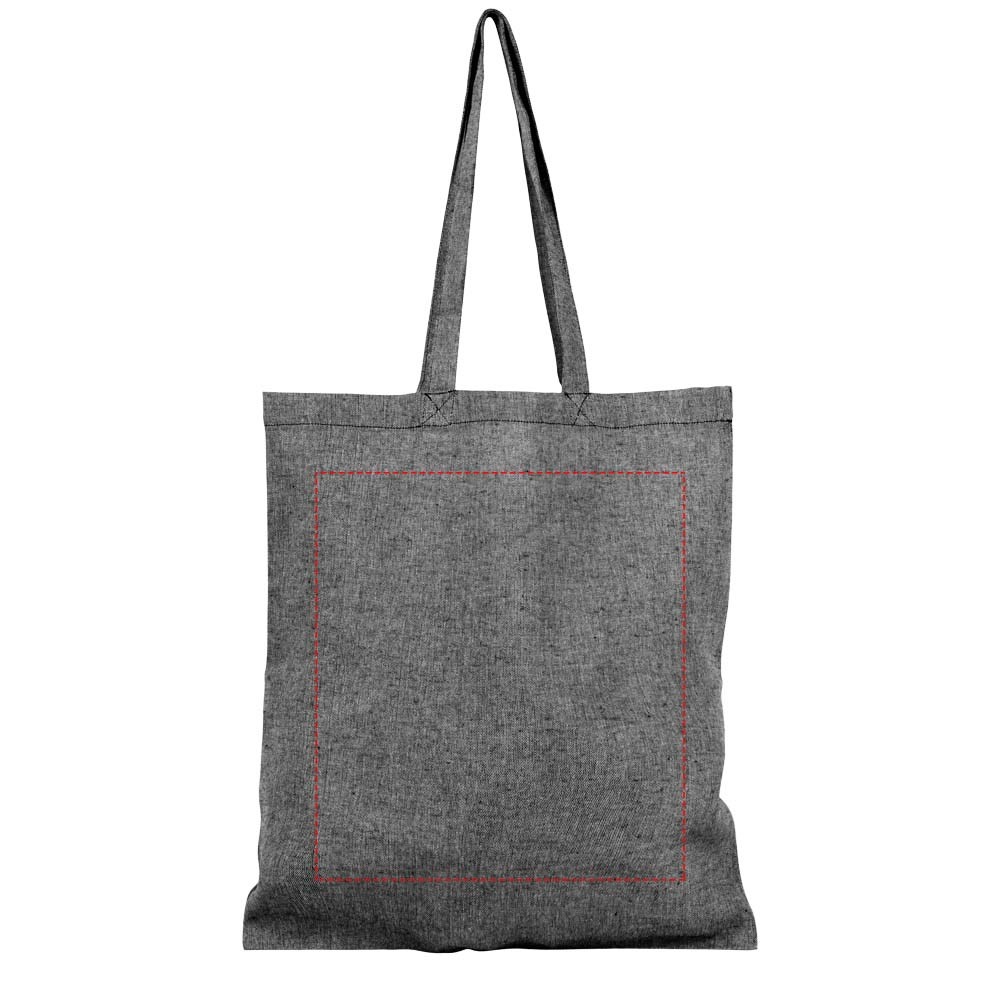 Draagtas gemaakt van 150 g/m² gerecycled katoen polyester mix met een hengsel van 31 cm. Gerecycled katoen wordt vervaardigd uit voor consumenten bestemd afval dat in textielfabrieken tijdens het snijproces wordt geproduceerd. Soortgelijke kleuren worden met elkaar gemengd, waardoor verven overbodig is. Deze tas kan worden opgevouwen om gemakkelijk mee te nemen. De perfecte metgezel voor een scala aan activiteiten zoals boodschappen doen en dagjes uit. Vanwege de aard van gerecycled katoen, kan er sprake zijn van een zeer lichte kleurvariatie. Dit kenmerkt een authentiekere uitstraling.