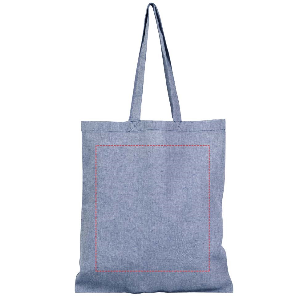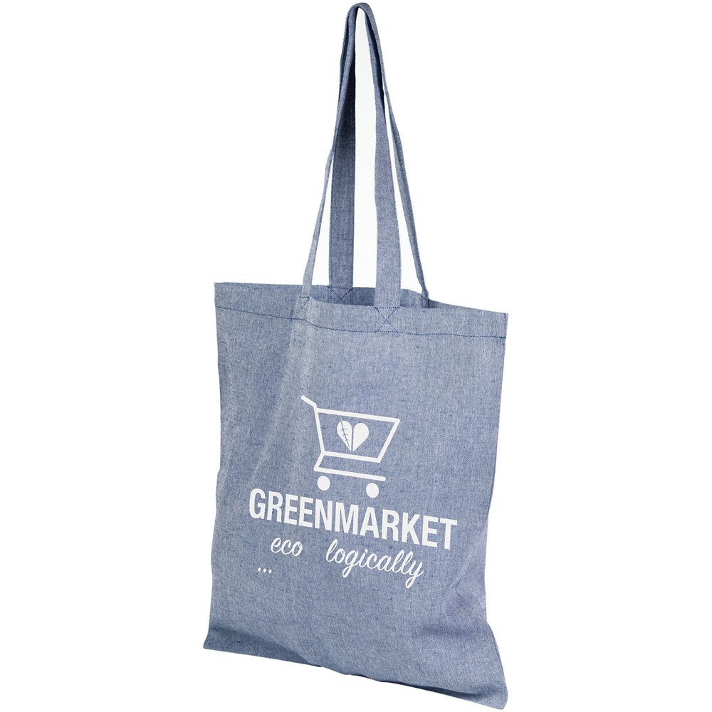 Draagtas gemaakt van 150 g/m² gerecycled katoen polyester mix met een hengsel van 31 cm. Gerecycled katoen wordt vervaardigd uit voor consumenten bestemd afval dat in textielfabrieken tijdens het snijproces wordt geproduceerd. Soortgelijke kleuren worden met elkaar gemengd, waardoor verven overbodig is. Deze tas kan worden opgevouwen om gemakkelijk mee te nemen. De perfecte metgezel voor een scala aan activiteiten zoals boodschappen doen en dagjes uit. Vanwege de aard van gerecycled katoen, kan er sprake zijn van een zeer lichte kleurvariatie. Dit kenmerkt een authentiekere uitstraling.