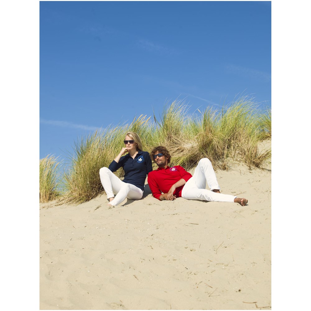 Vlakgebreide kraag. knopenlijst met twee knopen. Twee kleuren nektape. Gegraveerde knopen. Transfer maatlabel voor extra comfort. Label in zijnaad.