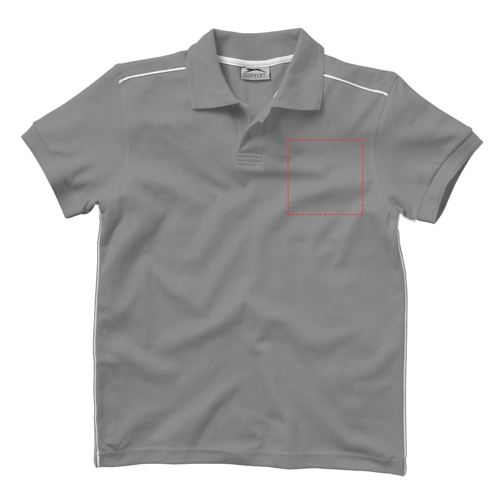 Vlakgebreide kraag. Contrast gekleurde tipping. Knopenlijst met één knoopje. Piping details. Nektape in contrasterende kleur. Gegraveerde knopen. Transfer maatlabel voor extra comfort.