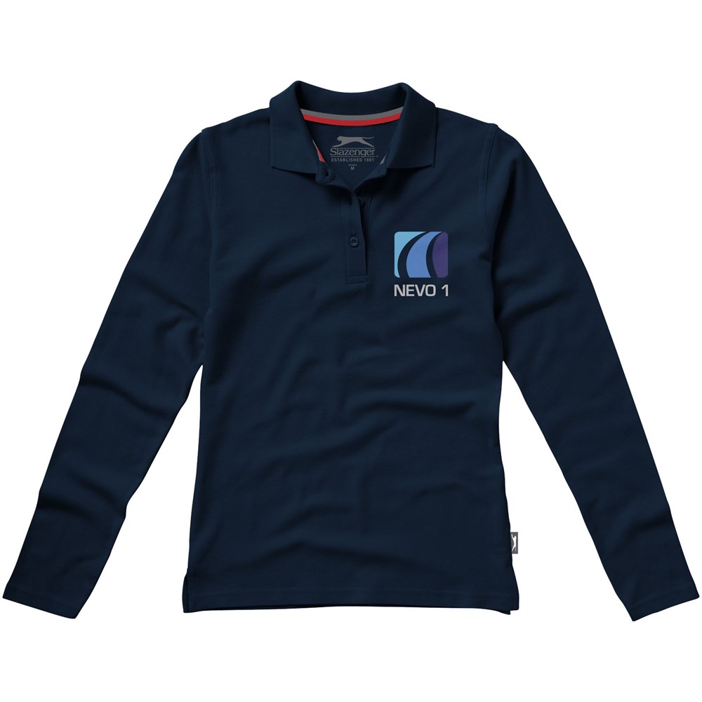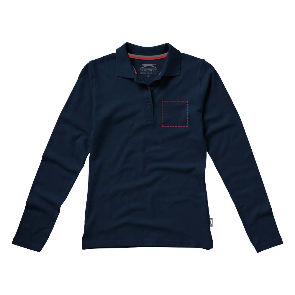 Vlakgebreide kraag. Knopenlijst met drie knopen. Twee kleuren nektape. Gegraveerde knopen. Transfer maatlabel voor extra comfort. Label in zijnaad.