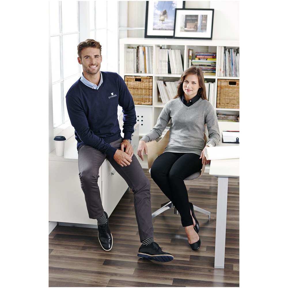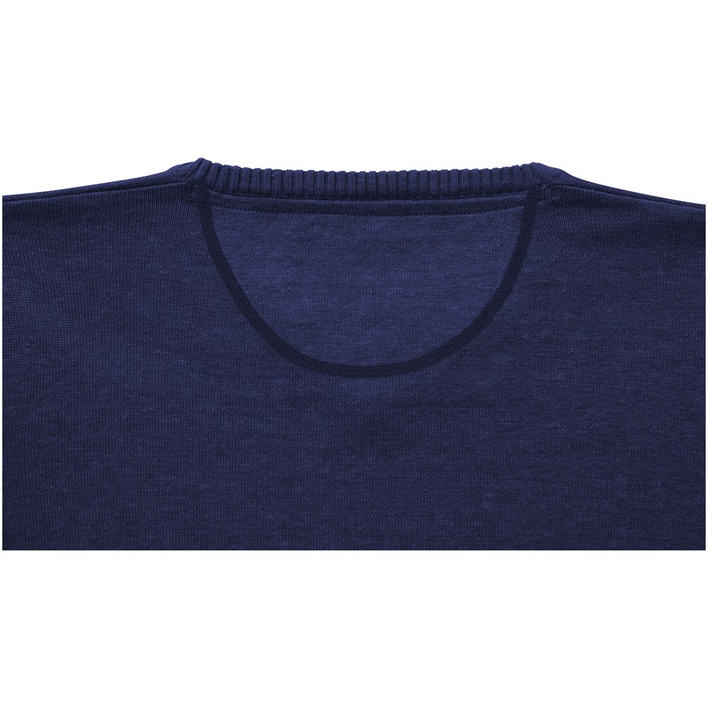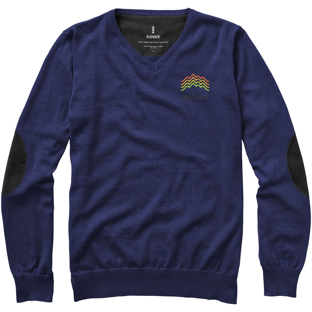 V-hals. Twill elleboogstukken in contrasterende kleur. Vlakgebreide kraag. Plat gebreide rib mouw. Ribgebreide onderzijde. Contrast gekleurde halve maan. Satijnen nektape. Transfer maatlabel voor extra comfort.