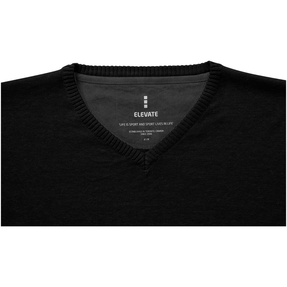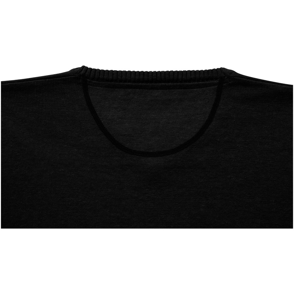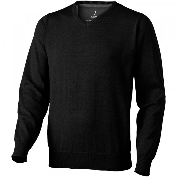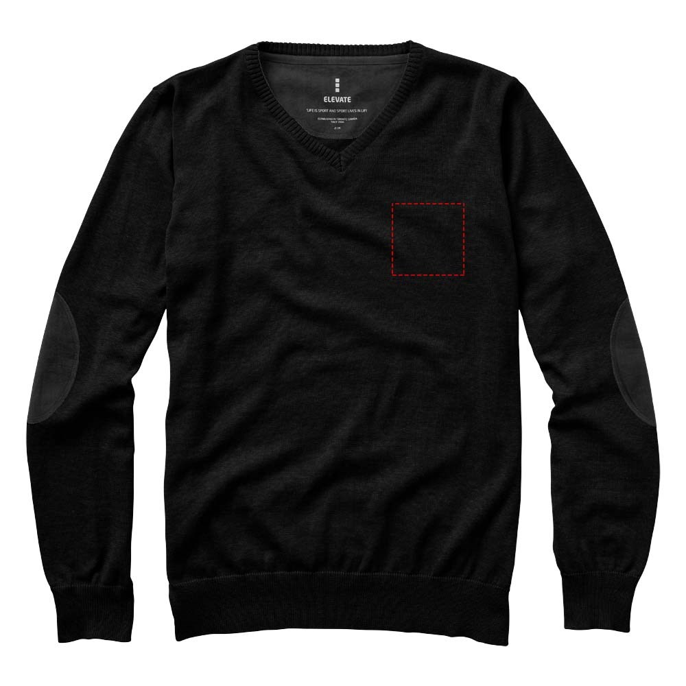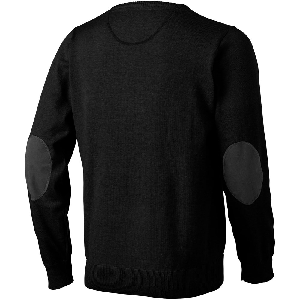 V-hals. Twill elleboogstukken in contrasterende kleur. Vlakgebreide kraag. Plat gebreide rib mouw. Ribgebreide onderzijde. Contrast gekleurde halve maan. Satijnen nektape. Transfer maatlabel voor extra comfort.