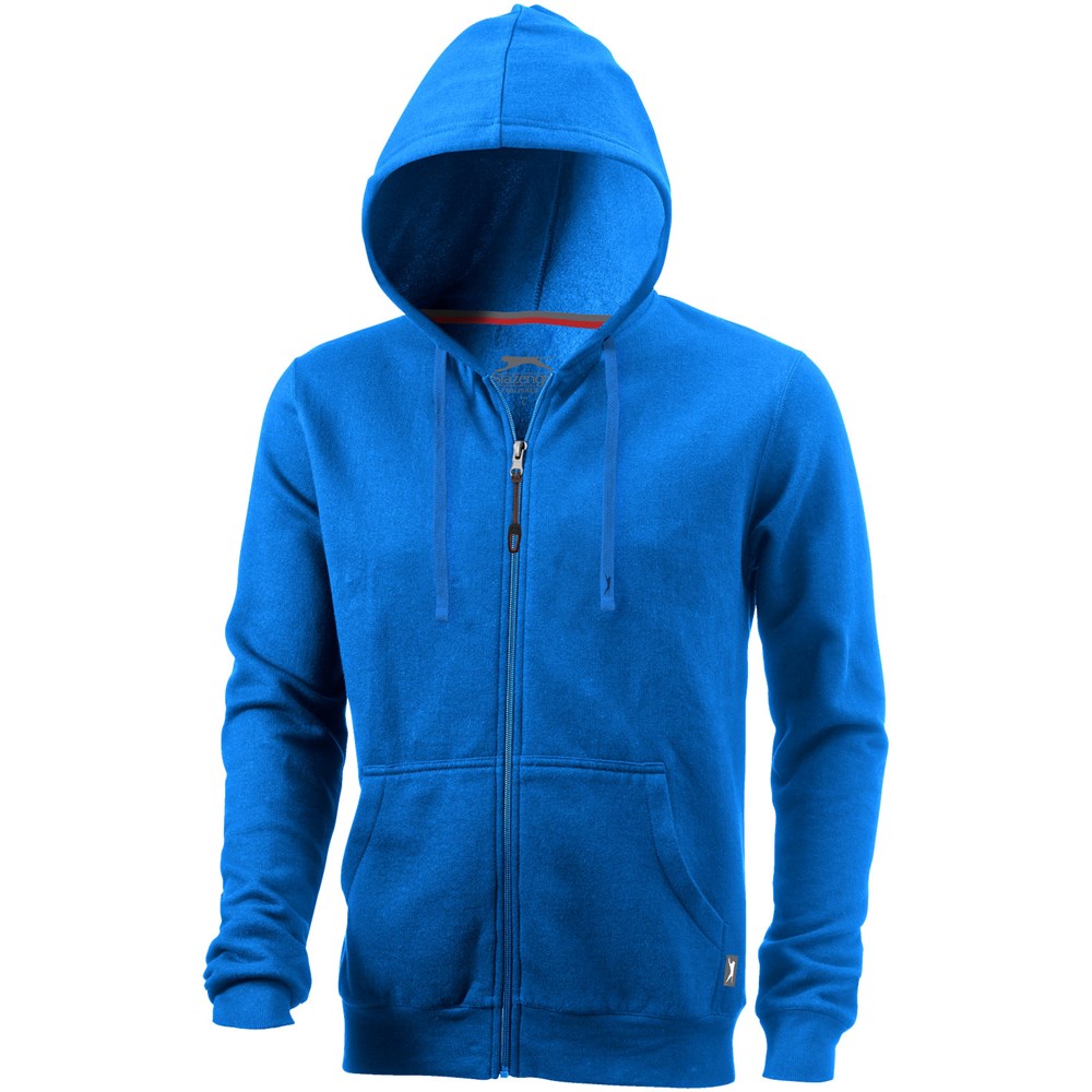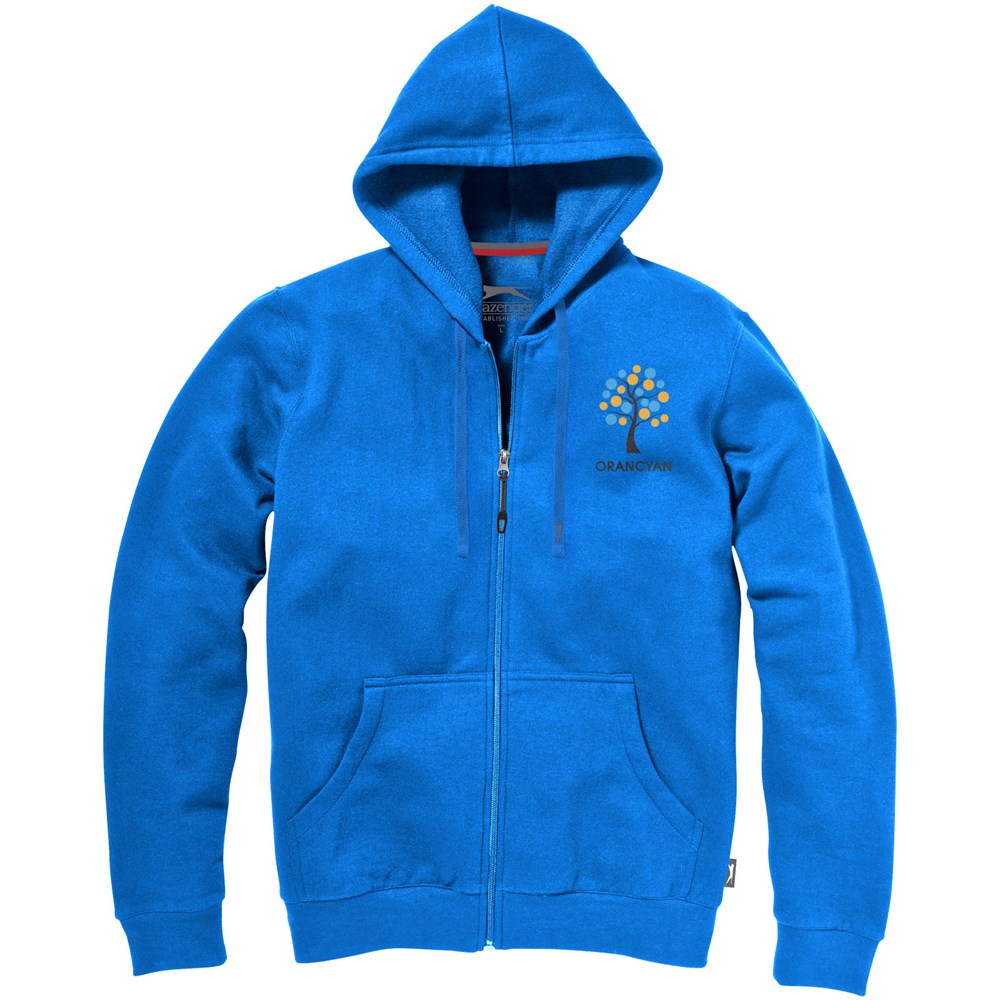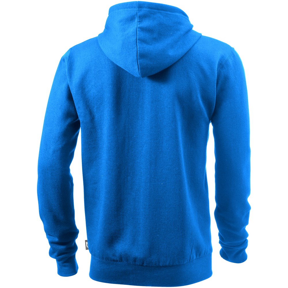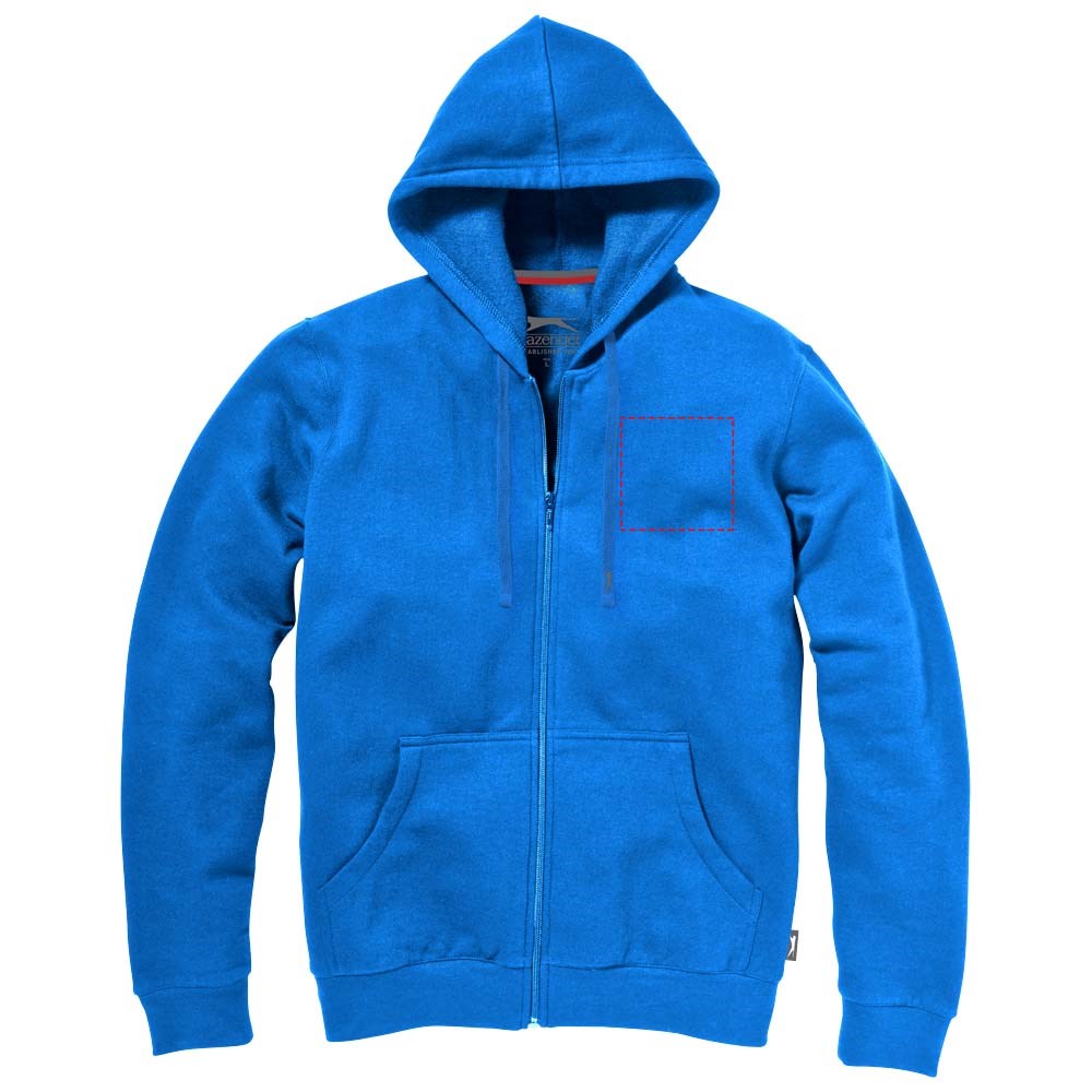 Plat gebreide rib mouw. Ribgebreide onderzijde. Trekkoord in capuchon. Kangoeroezak. 'Easy grip' ritstrekker. Twee kleuren nektape. Halve maan. Gegraveerde zilveren oogjes. Label in zijnaad. Transfer maatlabel voor extra comfort.