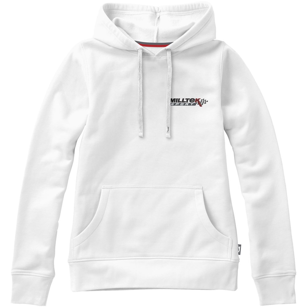 Plat gebreide rib mouw. Ribgebreide onderzijde. Trekkoord in capuchon. Kangoeroezak. Halve maan. Twee kleuren nektape. Gegraveerde zilveren oogjes. Label in zijnaad. Transfer maatlabel voor extra comfort.