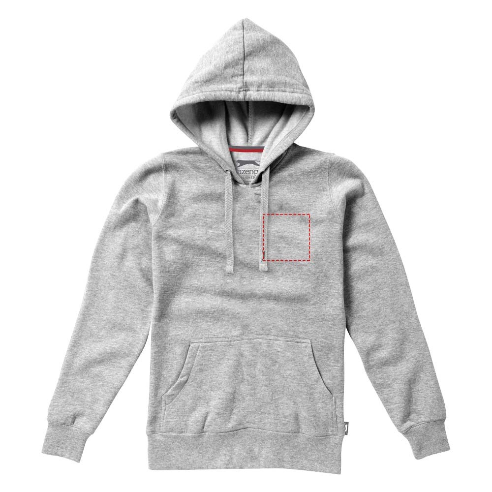 Plat gebreide rib mouw. Ribgebreide onderzijde. Trekkoord in capuchon. Kangoeroezak. Toelopende taille voor een meer flatterende pasvorm. Halve maan. Twee kleuren nektape. Gegraveerde zilveren oogjes. Label in zijnaad. Transfer maatlabel voor extra comfort.