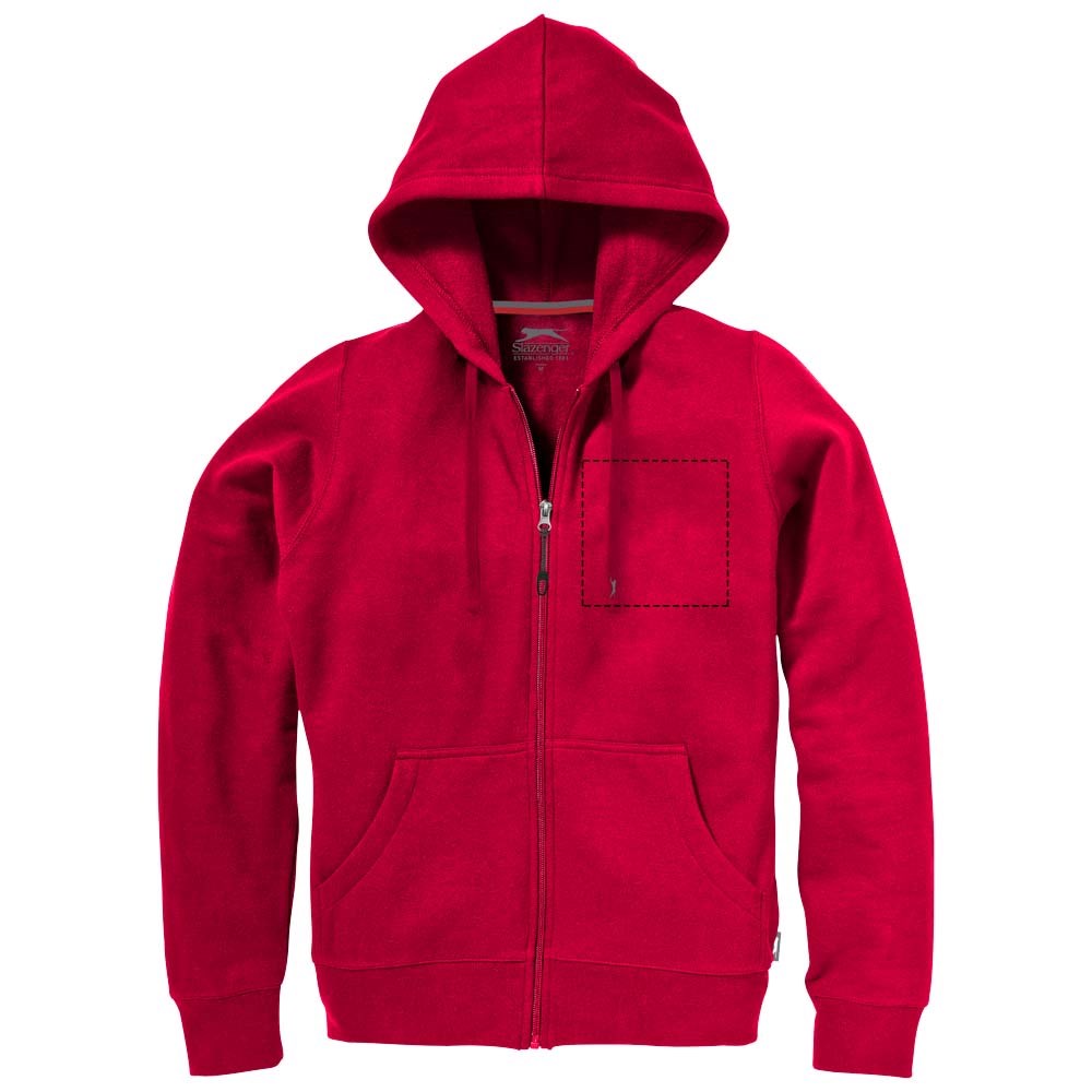 Plat gebreide rib mouw. Ribgebreide onderzijde. Kangoeroezak. Trekkoord in capuchon. Toelopende taille voor een meer flatterende pasvorm. 'Easy grip' ritstrekker. Halve maan. Twee kleuren nektape. Gegraveerde zilveren oogjes. Label in zijnaad.