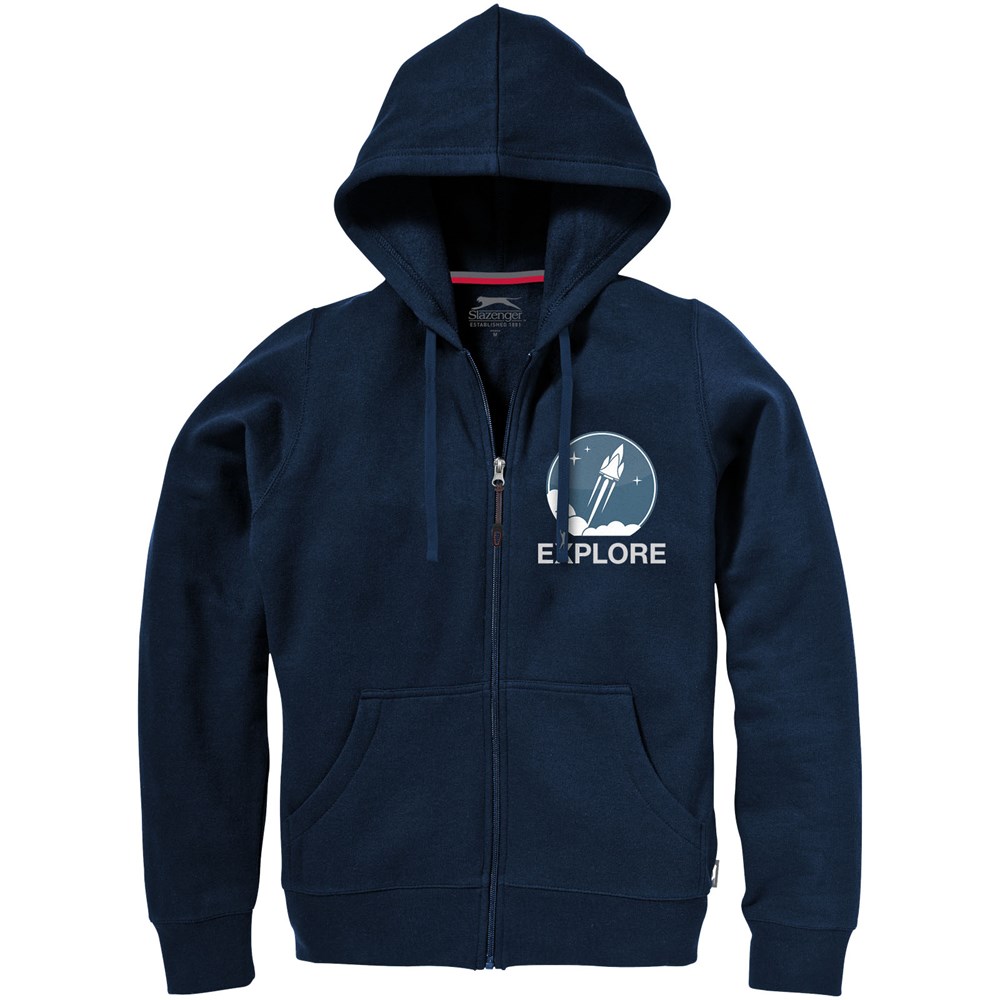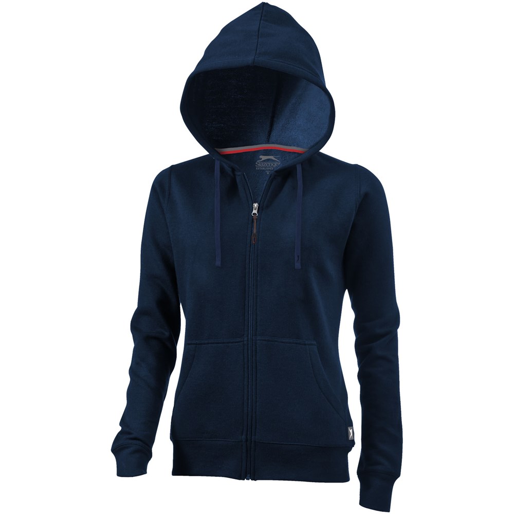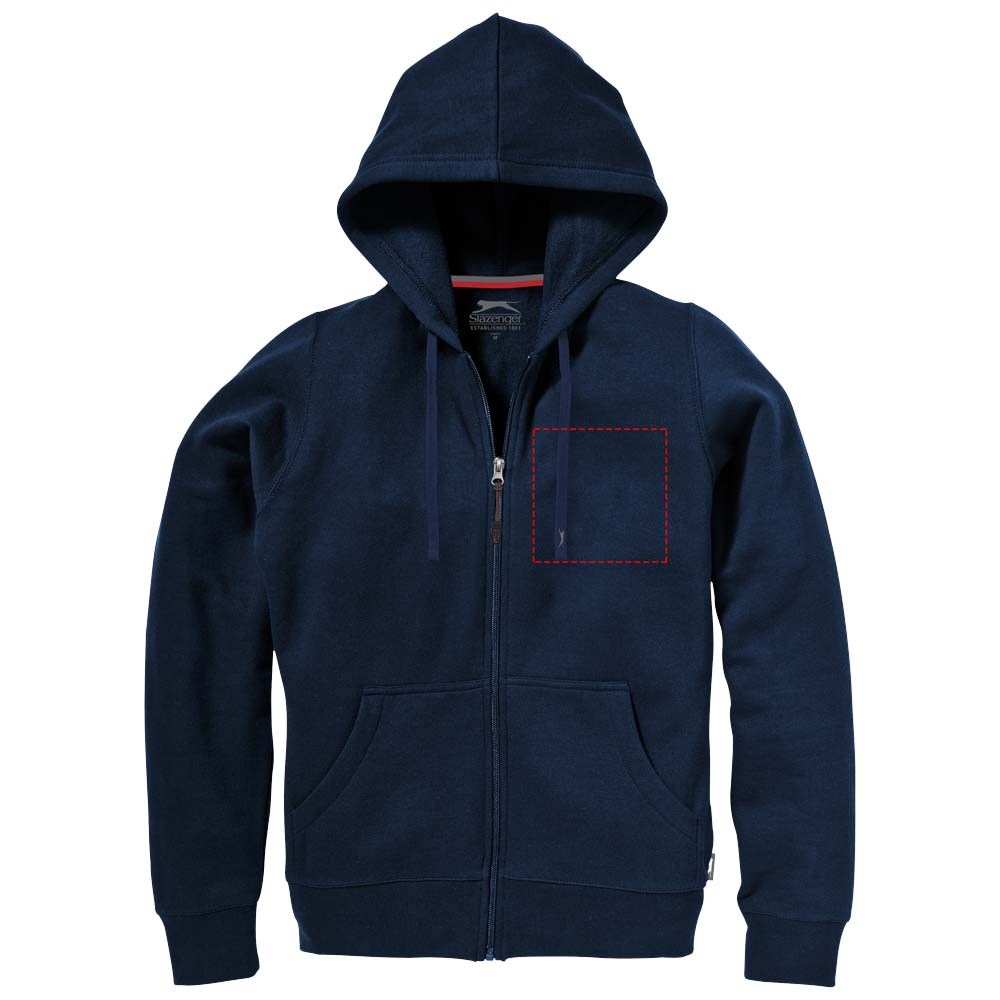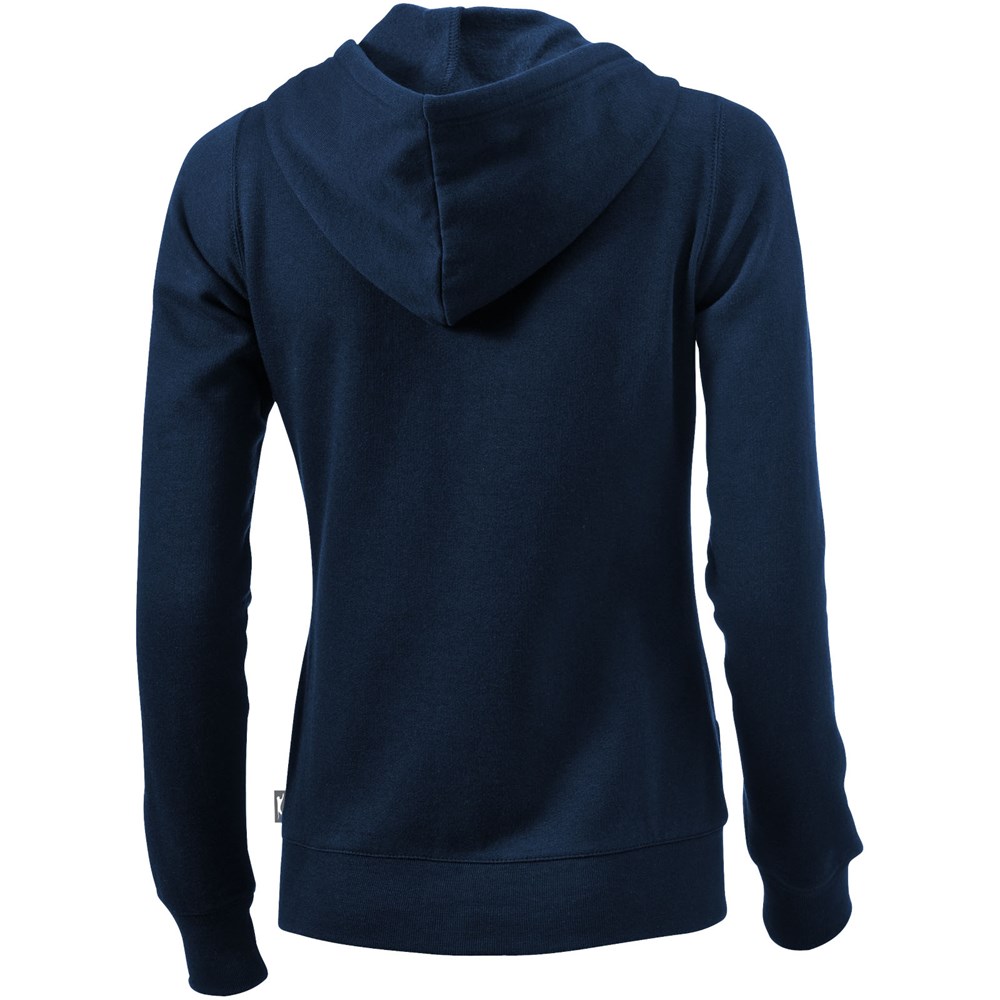Plat gebreide rib mouw. Ribgebreide onderzijde. Kangoeroezak. Trekkoord in capuchon. Toelopende taille voor een meer flatterende pasvorm. 'Easy grip' ritstrekker. Halve maan. Twee kleuren nektape. Gegraveerde zilveren oogjes. Label in zijnaad.