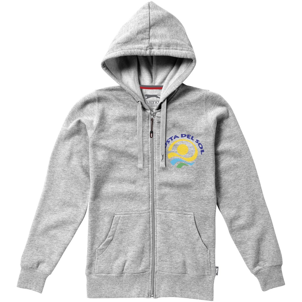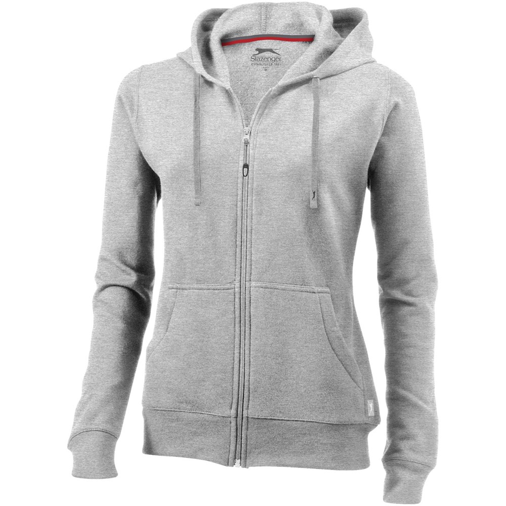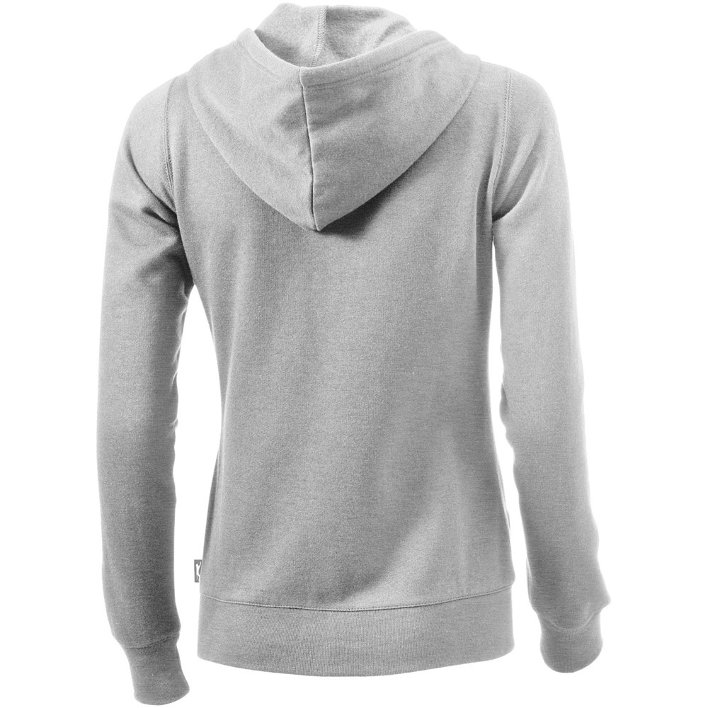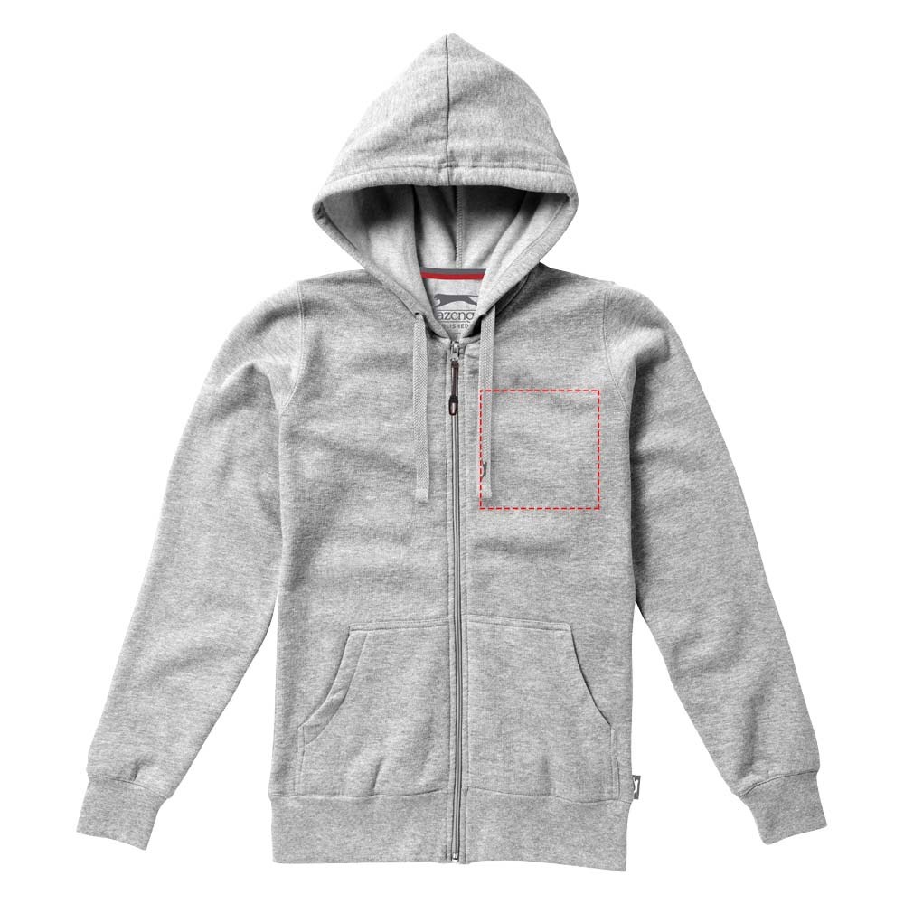 Plat gebreide rib mouw. Ribgebreide onderzijde. Kangoeroezak. Trekkoord in capuchon. Toelopende taille voor een meer flatterende pasvorm. 'Easy grip' ritstrekker. Halve maan. Twee kleuren nektape. Gegraveerde zilveren oogjes. Label in zijnaad.