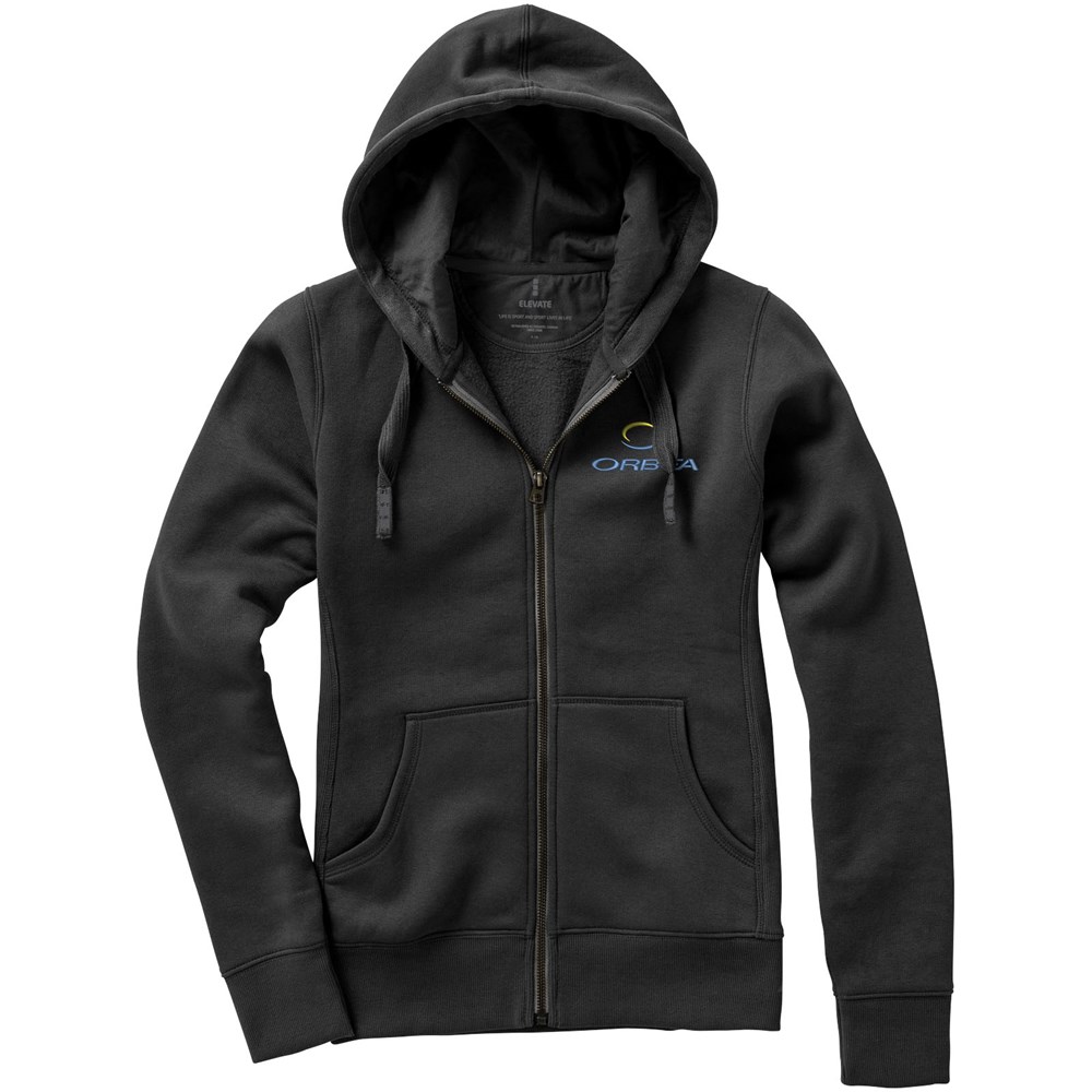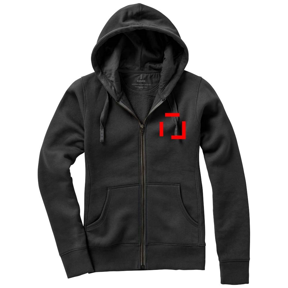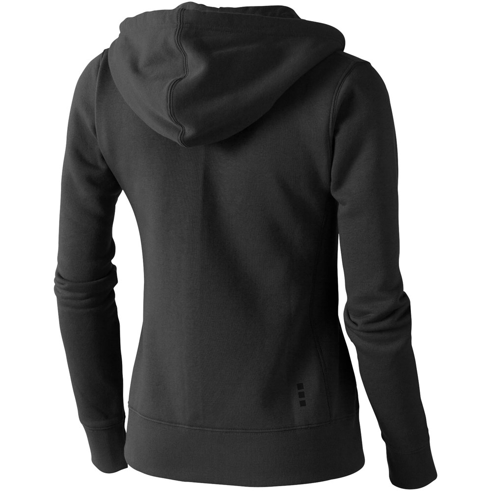 Ribgebreide zijpanelen. Plat gebreide rib mouw. Ribgebreide onderzijde. Trekkoord in capuchon. Kangoeroezak. Halve maan. Single jersey voering aan binnenkant capuchon. Gegraveerde zilveren oogjes. Satijnen nektape. contrast gekleurde visgraat tape.