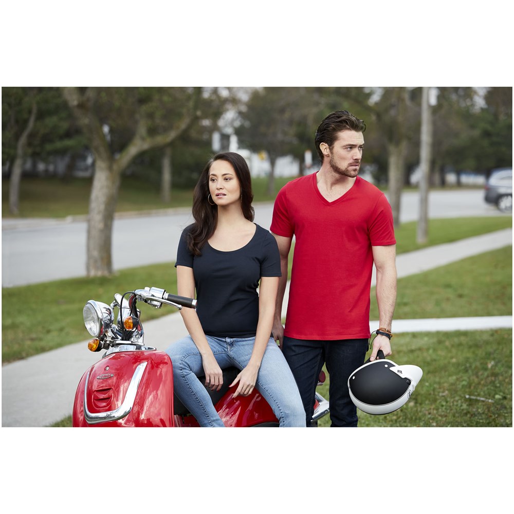 Naadloos cirkelvormig breisel. V-hals. Schouder tot schouder tape. Dubbele stiksels. Ophanglus in contrastkleur. Transfer maatlabel voor extra comfort.