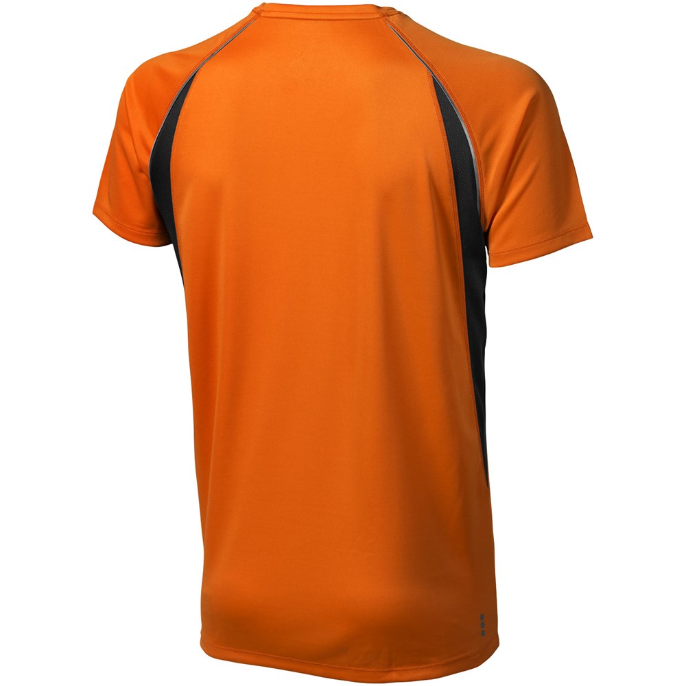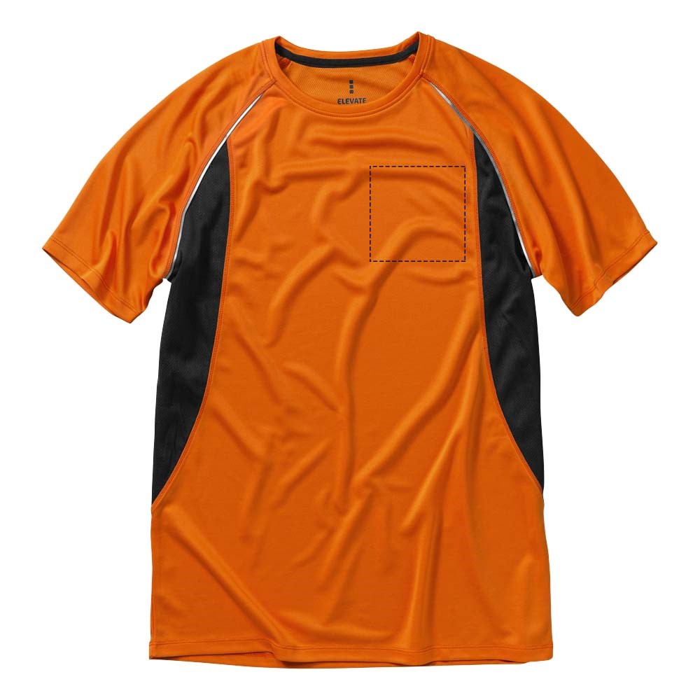 Boord in dezelfde stof. Ronde hals. Zijpanelen in mesh stof. Reflecterende details. Raglan mouwen. Transfer maatlabel voor extra comfort. Smallere details in flatlock steken. Satijnen nektape.