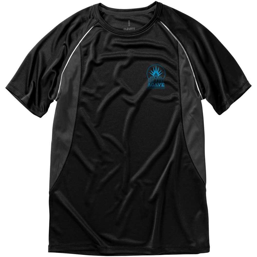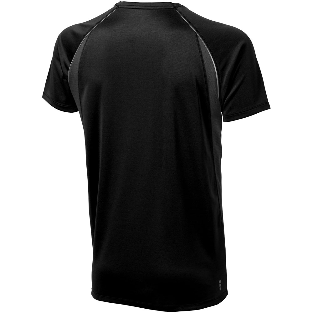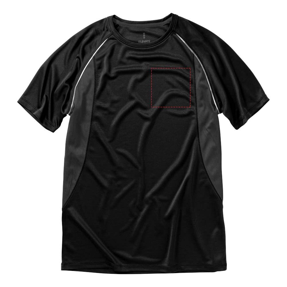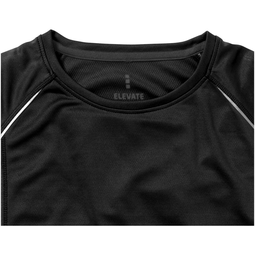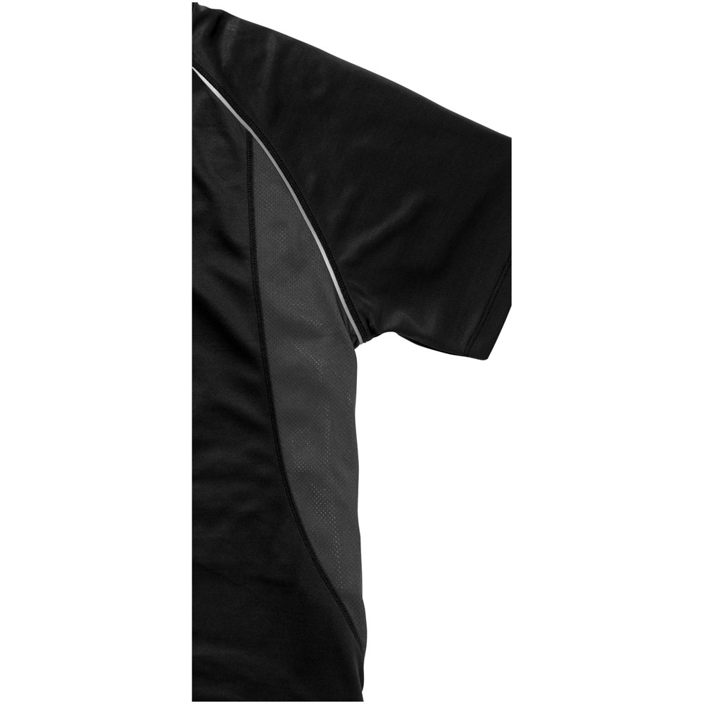 Boord in dezelfde stof. Ronde hals. Zijpanelen in mesh stof. Reflecterende details. Raglan mouwen. Transfer maatlabel voor extra comfort. Smallere details in flatlock steken. Satijnen nektape.