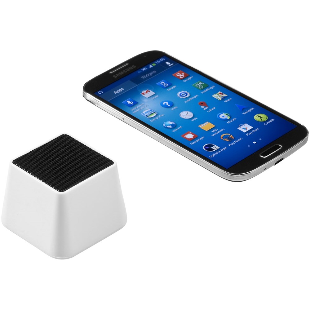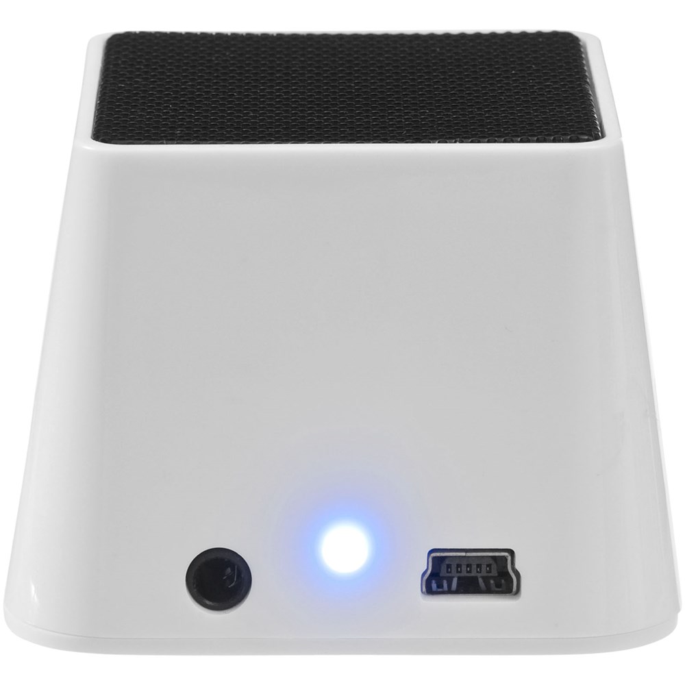 Draagbare Bluetooth® speaker met interne oplaadbare batterij, goed voor 4 uur non-stop muziek. speaker kan worden aangesloten via Bluetooth® of met de 3,5 mm audiokabel. Audio- en oplaadkabel meegeleverd. Geleverd in een witte kartonnen geschenkverpakking.