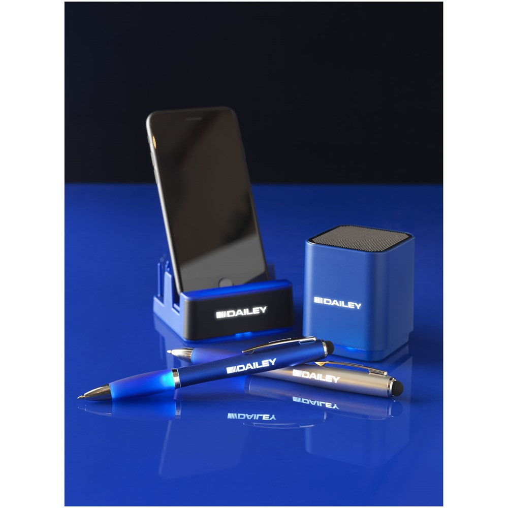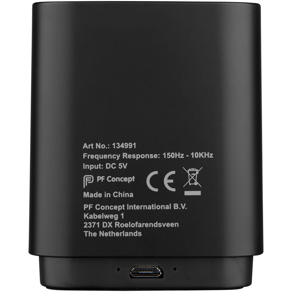 De Beam light-up Bluetooth®-speaker heeft een interne oplaadbare batterij die maximaal 1,5 uur non-stop muziek levert. Onder het voorste gedeelte van de speakerbehuizing bevindt zich een LED-paneel. Wanneer het voorste gedeelte is gedecoreerd met een laser, licht je logo op! Een micro USB-oplaadkabel is inbegrepen. Het Bluetooth®-bereik is 10 meter. De oplaadtijd is 2 uur.