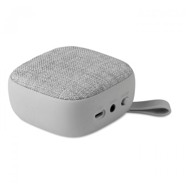 Vierkante 3W draadloze luidspreker met stoffen materiaal en rubberen afwerking. Oplaadbare Li-Ion 450 mAh batterij. Voorzien van een zwart aluminiumplaatje ideaal voor bedrukking.