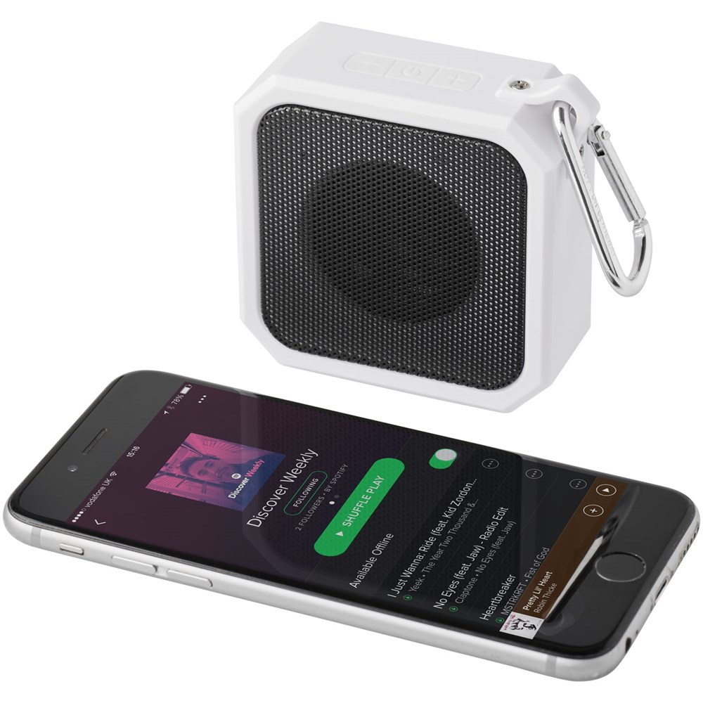 De Blackwater Bluetooth® speaker voor buitenshuis is een must-have voor iedereen die van het buitenleven houdt. De 3W-speaker biedt een uitstekende geluidskwaliteit en met een waterdichtheidsniveau van IPX6 hoef je je geen zorgen te maken dat de speaker beschadigd raakt wanneer deze nat wordt. Er zit ook een karabijnhaak (niet geschikt voor klimmen) bij, wat de speaker zeer geschikt maakt voor op reis. De afspeeltijd op maximaal volume is 2 uur. Ingebouwde muziekbediening en een microfoon voor handsfree bellen. Inclusief micro-USB-oplaadkabel. Bluetooth® bereik is 10 meter (33ft) met Bluetooth® versie 5.0.