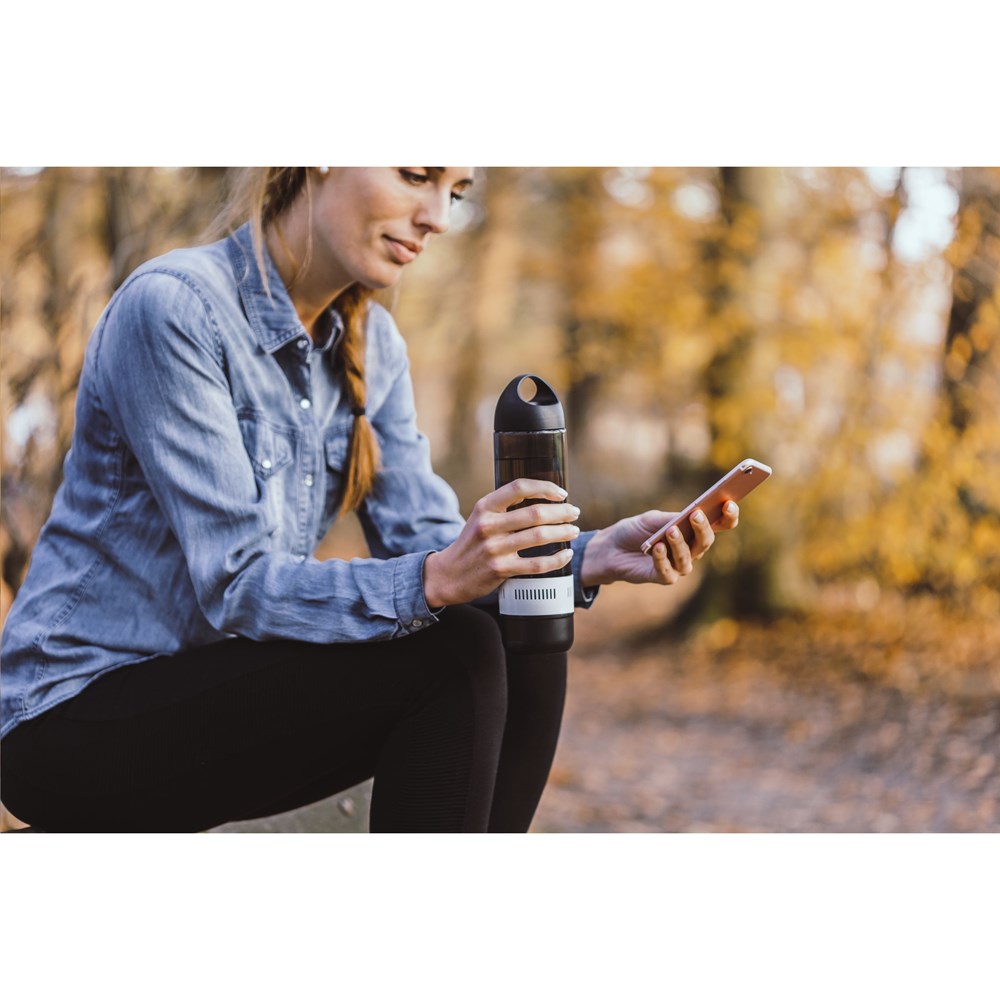 Waterfles en speaker ineen. Waterfles van BPA-vrij Eastman Tritan™. Met schroefdop. De afneembare, bluetooth (versie 4.2) speaker aan de onderzijde is compatibel met de meest gangbare smartphones en tablets. Bereik tot 10 meter. Ideaal tijdens je work out. Vermogen 3W. Frequentie: 20HZ-20KHz. Met ingebouwde 300mAh li-ion batterij voor lang luisterplezier. Inhoud fles 500 ml. Incl. micro-USB oplaadkabel en gebruiksaanwijzing. Per stuk in doos.