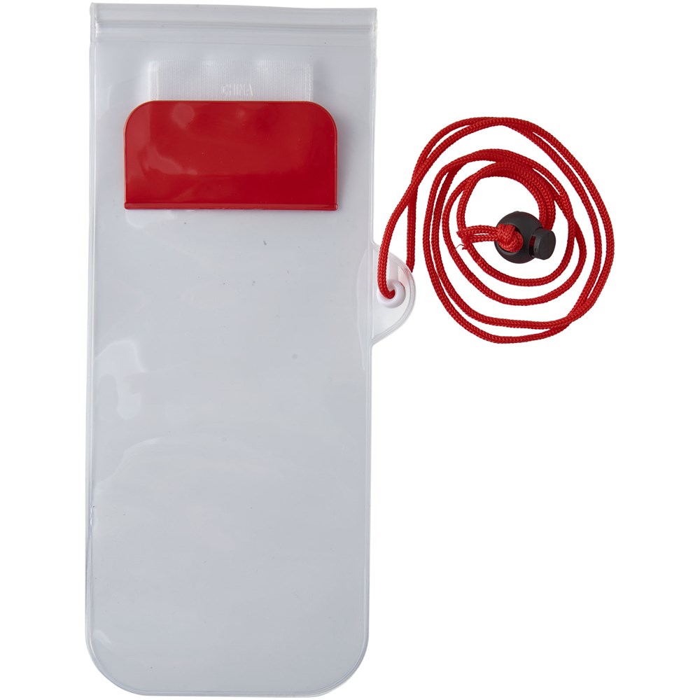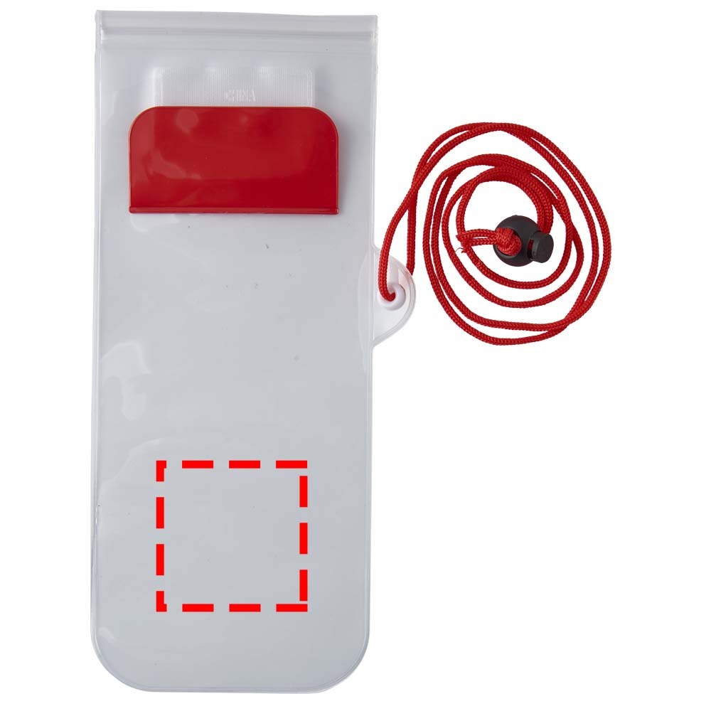 Opbergtas met matte witte achterzijde transparant, doorzichtig touch scherm met ritssluiting en gekleurde flap met klittenbandsluiting. Inclusief nekkoord met trekkoord sluiting.