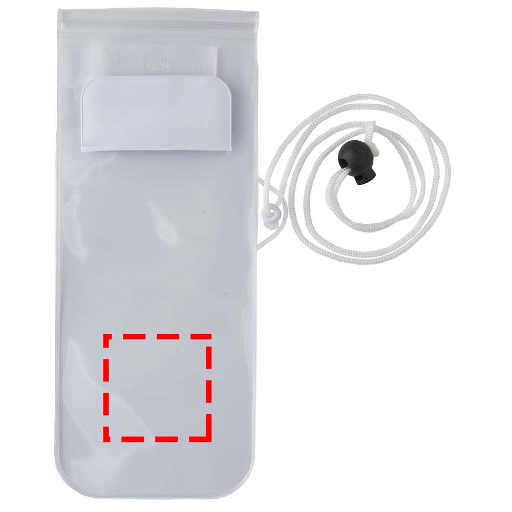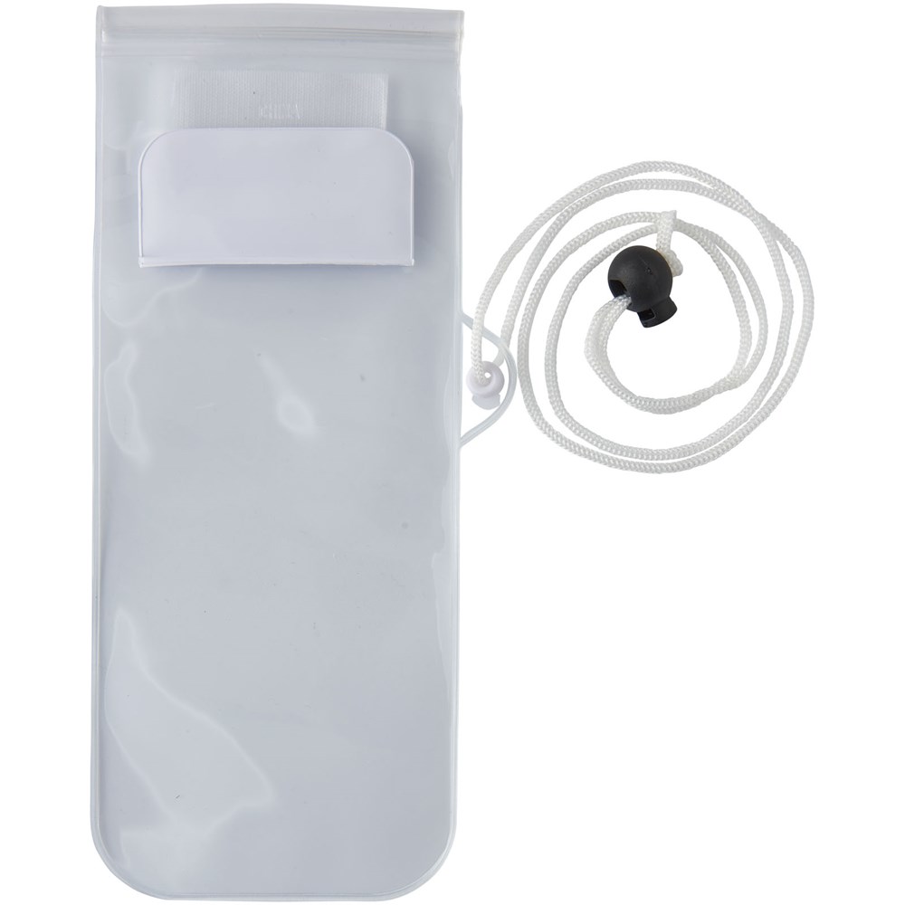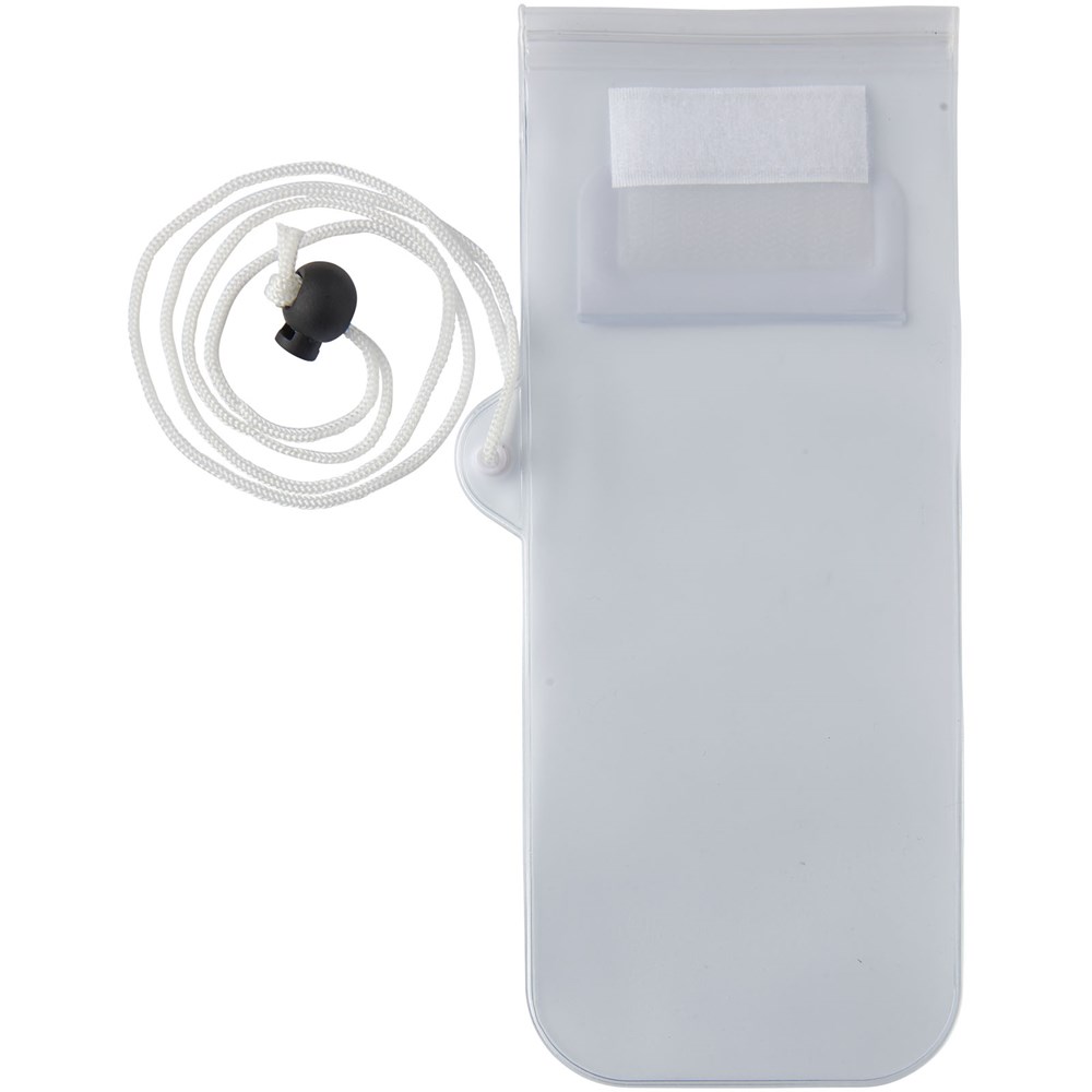Opbergtas met matte witte achterzijde transparant, doorzichtig touch scherm met ritssluiting en gekleurde flap met klittenbandsluiting. Inclusief nekkoord met trekkoord sluiting.