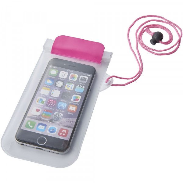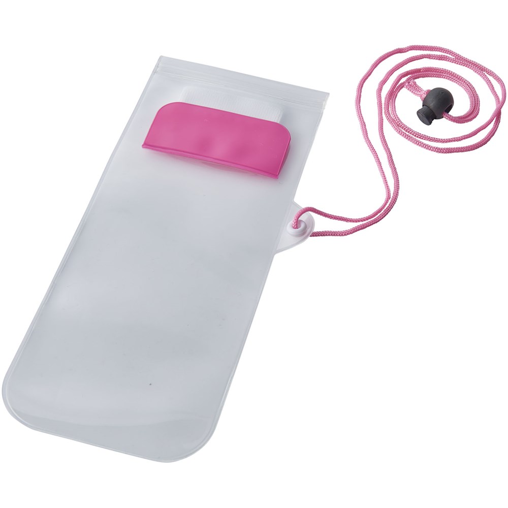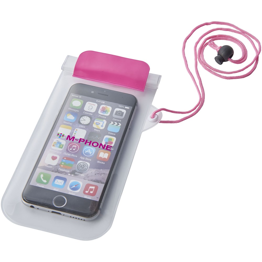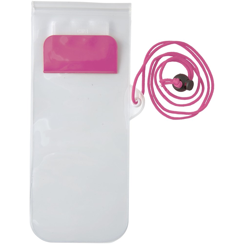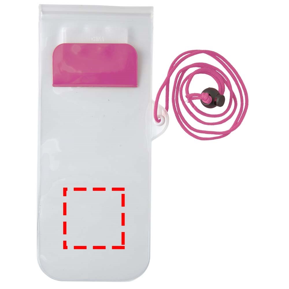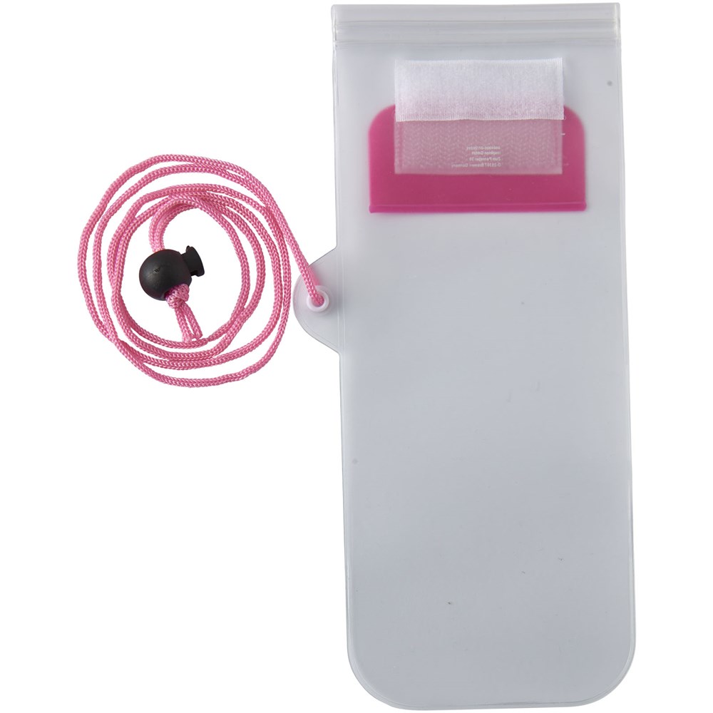 Opbergtas met matte witte achterzijde transparant, doorzichtig touch scherm met ritssluiting en gekleurde flap met klittenbandsluiting. Inclusief nekkoord met trekkoord sluiting.