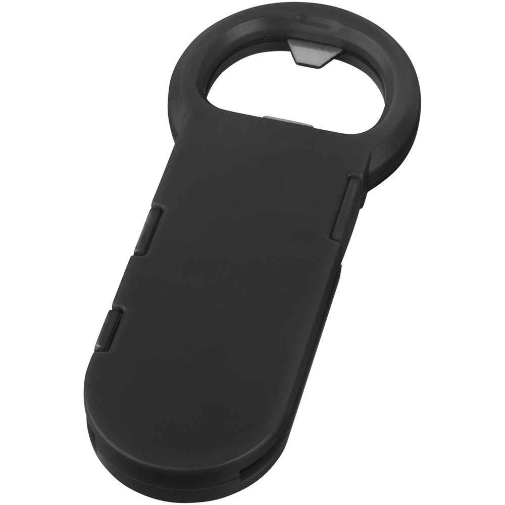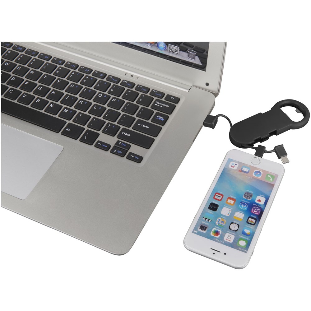 Een combinatie van flesopener en 3-in-1 oplaadkabel. De kabel heeft een USB type-C uiteinde en een 2-in-1 dubbel compatibel uiteinde voor zowel Apple® iOS- als Android-apparaten.