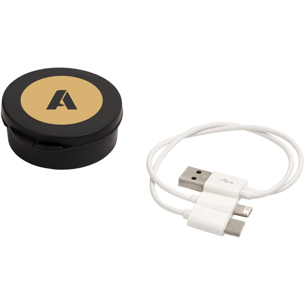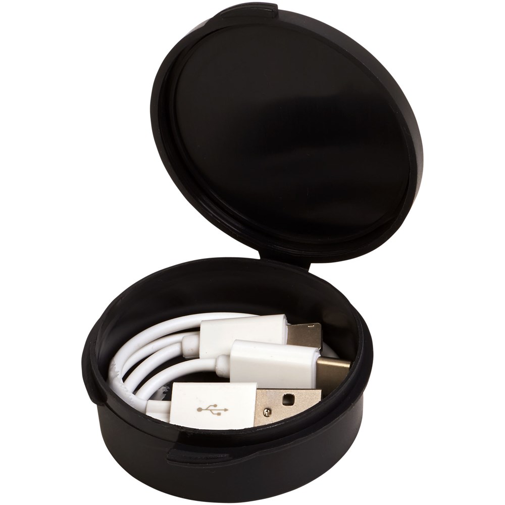 De Versa 3-in-1 oplaadkabel is verpakt in een handige, ronde cassette. Het multi-USB snoer is voorzien van een USB Type C aansluiting en een 2-in-1 dubbelcompatibele stekker voor zowel Apple® iOS als Android apparatuur.