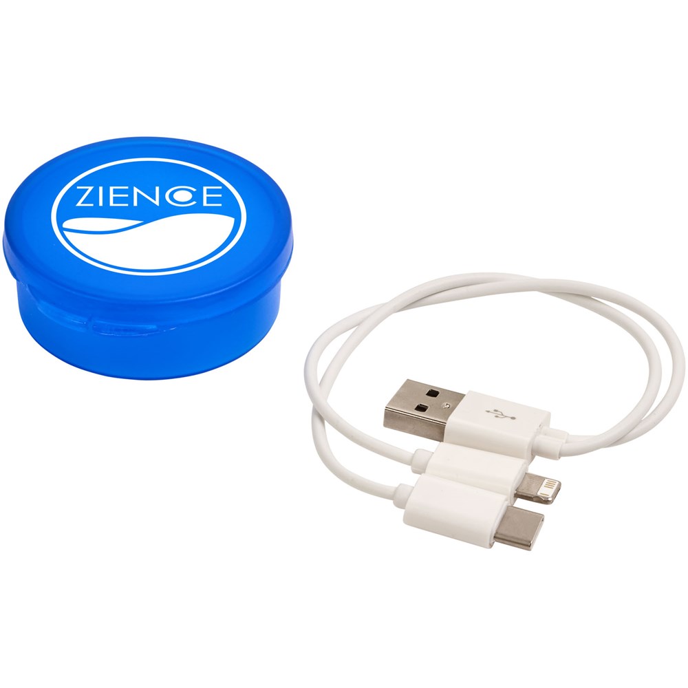 De Versa 3-in-1 oplaadkabel is verpakt in een handige, ronde cassette. Het multi-USB snoer is voorzien van een USB Type C aansluiting en een 2-in-1 dubbelcompatibele stekker voor zowel Apple® iOS als Android apparatuur.