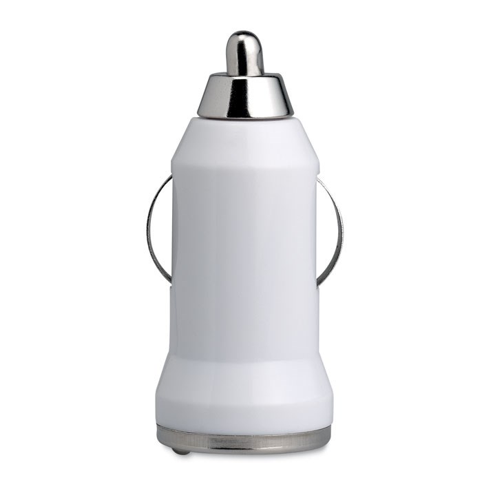 USB autolader in ABS behuizing en aluminium legering, met rood licht als oplaadindicator.