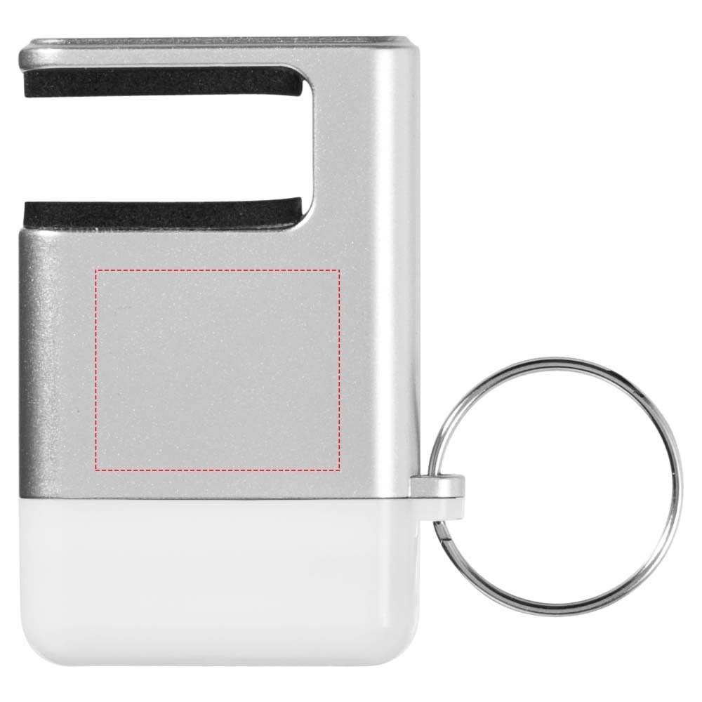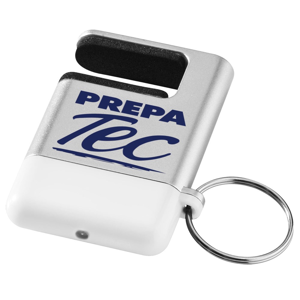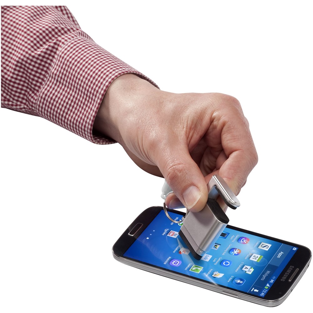 Mobiele telefoonhouder met schermreiniger en sleutelhanger.