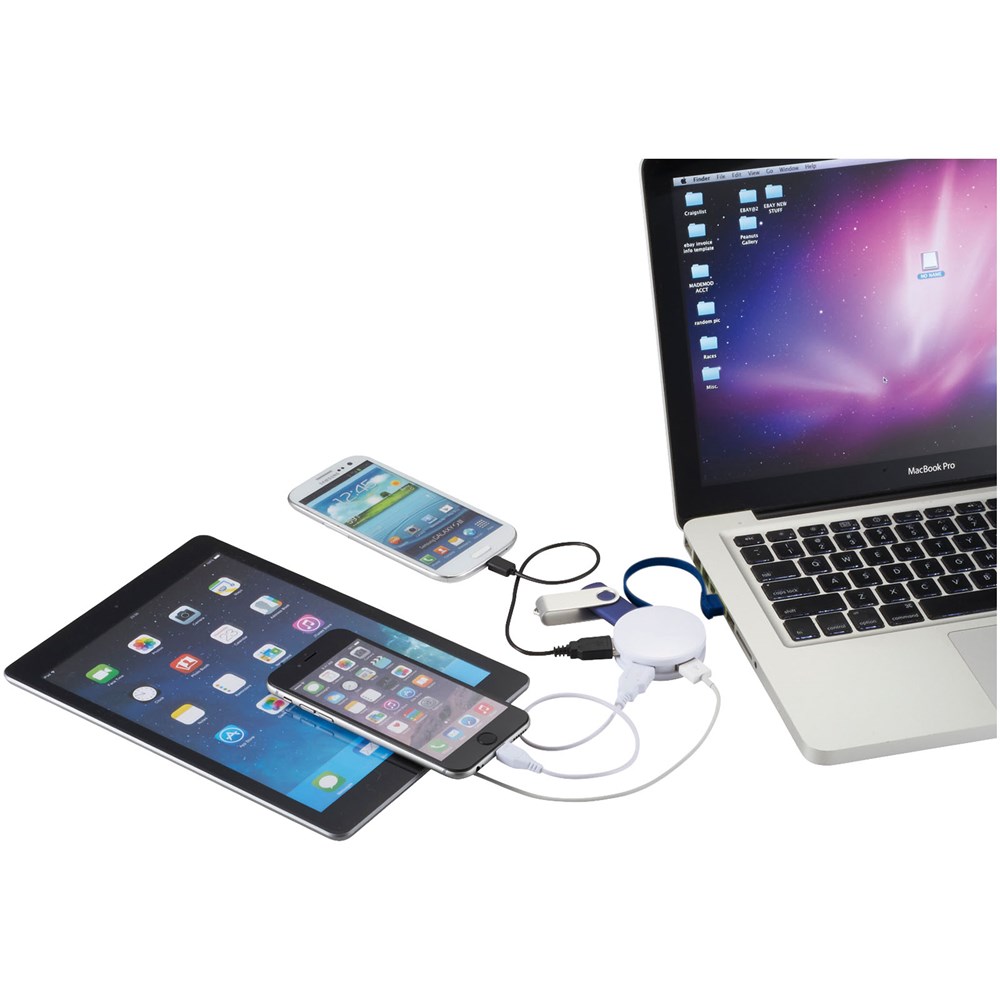 Ronde USB hub met 4 poorten en een input-poort aan de binnenkant.meer
