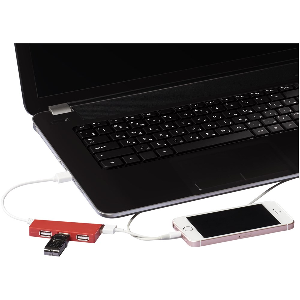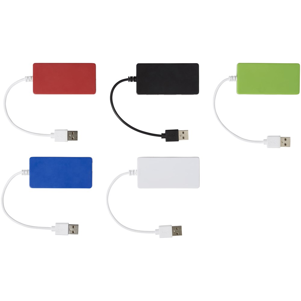 Baksteenvormige 4-poorts USB 2.0-hub. Compatibel met elke USB-poort. Hiermee kunt u tegelijkertijd meerdere apparaten opladen. Kabellengte is 19,3 cm.