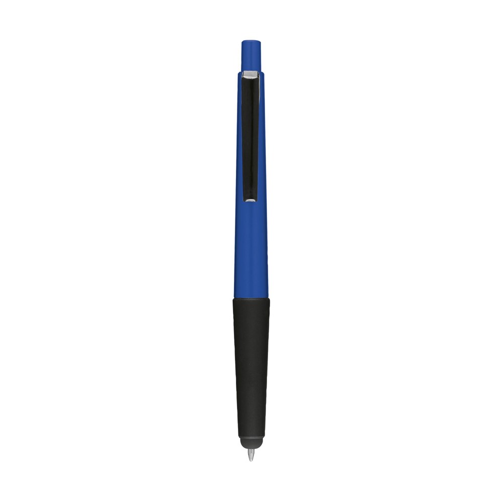 Blauwschrijvende metallic look balpen met gripvast voorstuk, drukknop en rubberen top/pointer voor het bedienen van touchscreens (zoals iPhone/iPad).