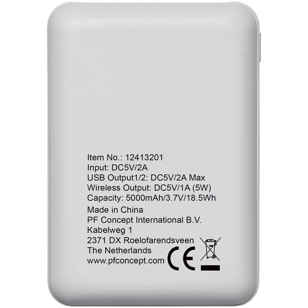 Deze compacte powerbank heeft een 5000 mAh klasse A lithium-polymeeraccu en een in- en uitgangsvermogen van 5 V/2 A. Door de bescheiden omvang is hij perfect voor onderweg. Ondersteunt 5 W draadloos opladen en opladen met oplaadkabel via USB-poort. Draadloos opladen werkt alleen met smartphones waarbij dit wordt ondersteund. Voor apparaten die geen ondersteuning bieden voor draadloos opladen, is een externe draadloze oplaadontvanger of ontvangstkast vereist.