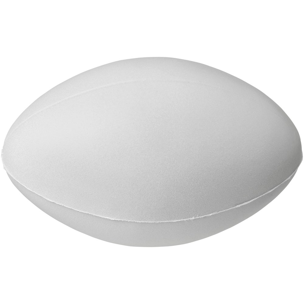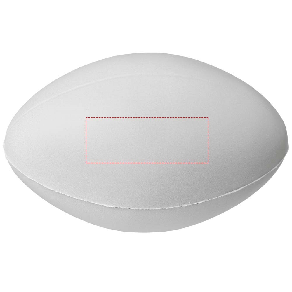 Rugby ball-shaped stress reliever with PU foam. Stress relievers vary slightly in density, color, size, and weight due to mold process which may prevent precise and uniform imprint. Imprint may break up.