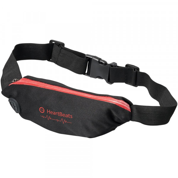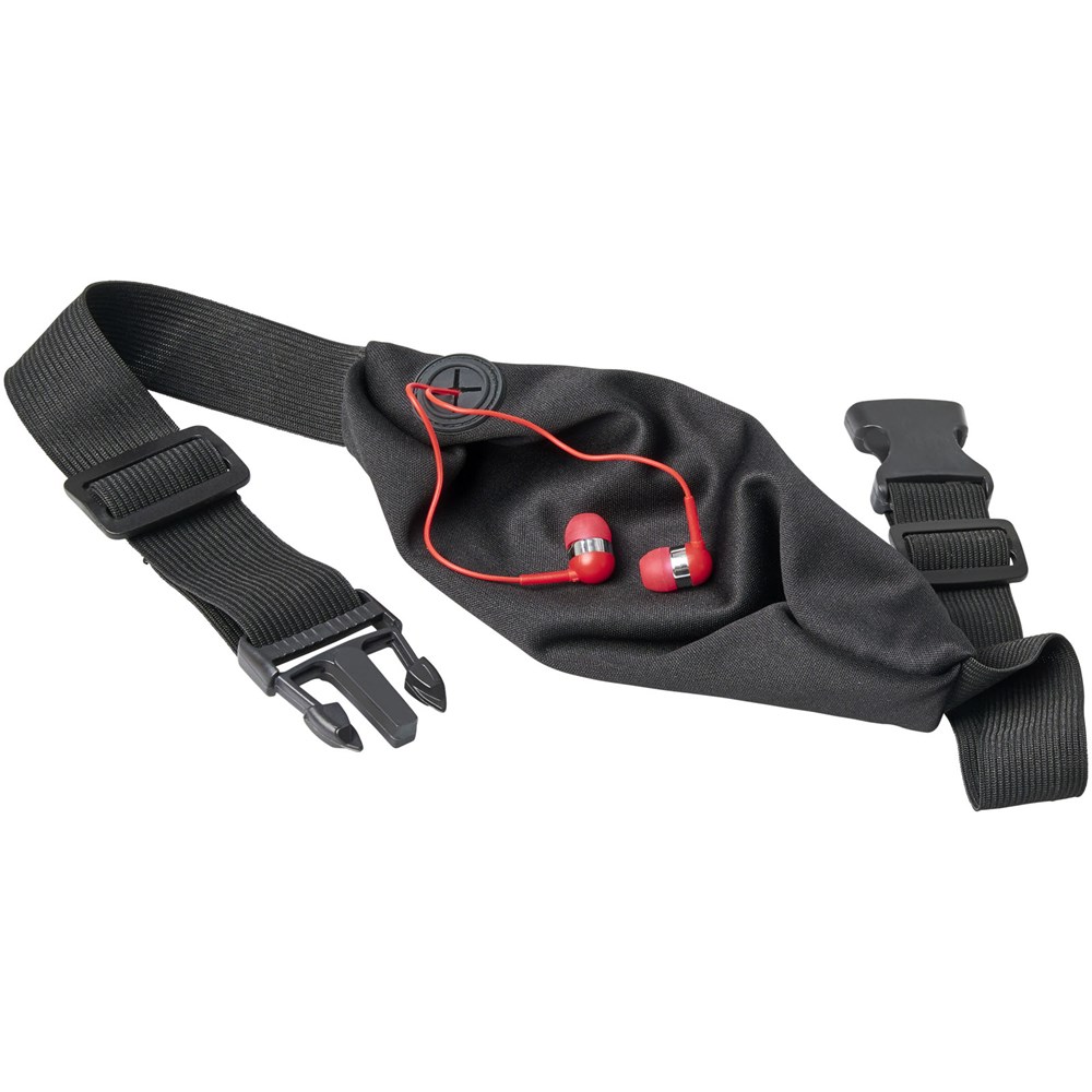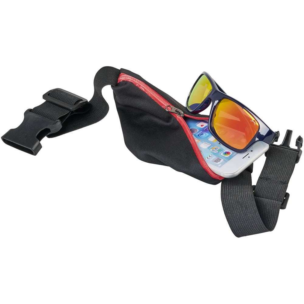 Flexibele sportheuptas met gekleurde rits en oordopjesuitgang. Het spandex materiaal en de elastische heupband met gespsluiting zorgen voor flexibiliteit tijdens het trainen of andere buitenactiviteiten. Groot decoratievlak aan de voorkant.