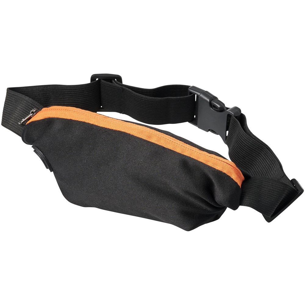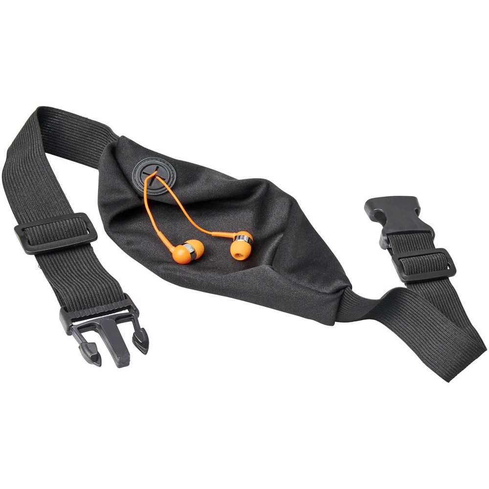 Flexibele sportheuptas met gekleurde rits en oordopjesuitgang. Het spandex materiaal en de elastische heupband met gespsluiting zorgen voor flexibiliteit tijdens het trainen of andere buitenactiviteiten. Groot decoratievlak aan de voorkant.