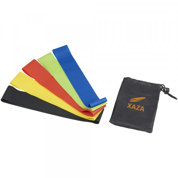 Set van 5 duurzame weerstandsbanden (60x5 cm.) met verschillende sterkten. Elk band biedt een soepele en consistente stretch. Door dat de banden extra weerstand bieden gaat de intensiviteit van de oefeningen omhoog. Te gebruiken in allerlei sporten. Inclusief opbergtasje. Afmeting en weerstand voor de verschillende banden: groen 0,35 mm/4,5 kg/10 lbs, blauw 0,50 mm/5,4 kg/12 lbs, geel 0,7 mm/7,2 kg/16 lbs, rood 0,9 mm/8,1 kg/18 lbs, zwart 1,1 mm/9 kg/20 lbs.