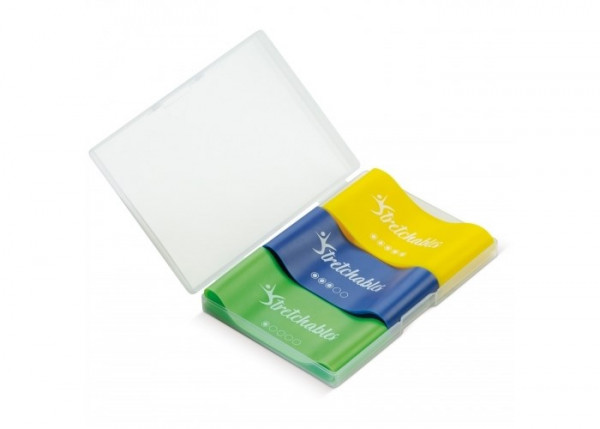 Deze fitness weerstandsbanden set bevat drie verschillende weerstandsbanden, een handleiding en een opbergdoosje. Elke band heeft zijn eigen weerstandsniveau: van licht tot zwaar. Het niveau wordt aangegeven met stippen op de banden en door de kleur. De handleiding bevat oefeningen beschreven in eenvoudige stappen.