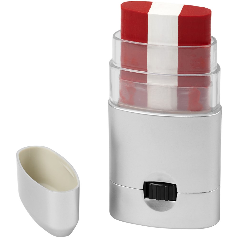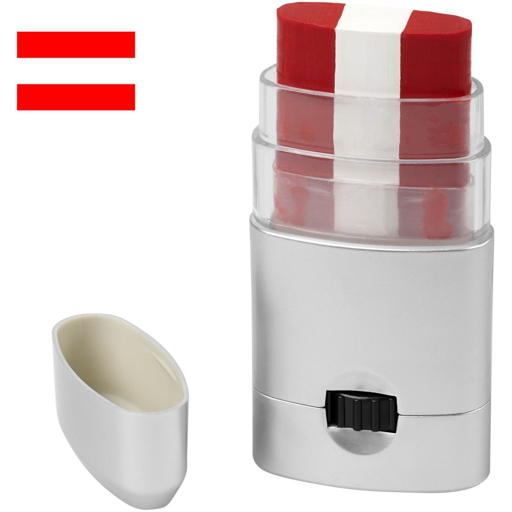 Gemakkelijk te reinigen bodypaint beschikbaar in een breed scala aan kleurencombinaties die de vlaggen van Frankrijk, Duitsland, Italië, Nederland, België, Portugal, Spanje, Oostenrijk, Denemarken, Zwitserland, Zweden en Polen vertegenwoordigen. Kan ook op het gezicht worden aangebracht en kan worden verwijderd met make-upreiniger of met water en zeep. Geproduceerd volgens GMP (Good Manufacturing Practices) nalevingsvereisten en voldoet aan de EU-regelgeving voor cosmetische producten (Verordening (EG) nr. 1223/2009). CPNP registratienummer 3260279.