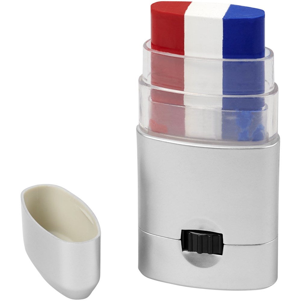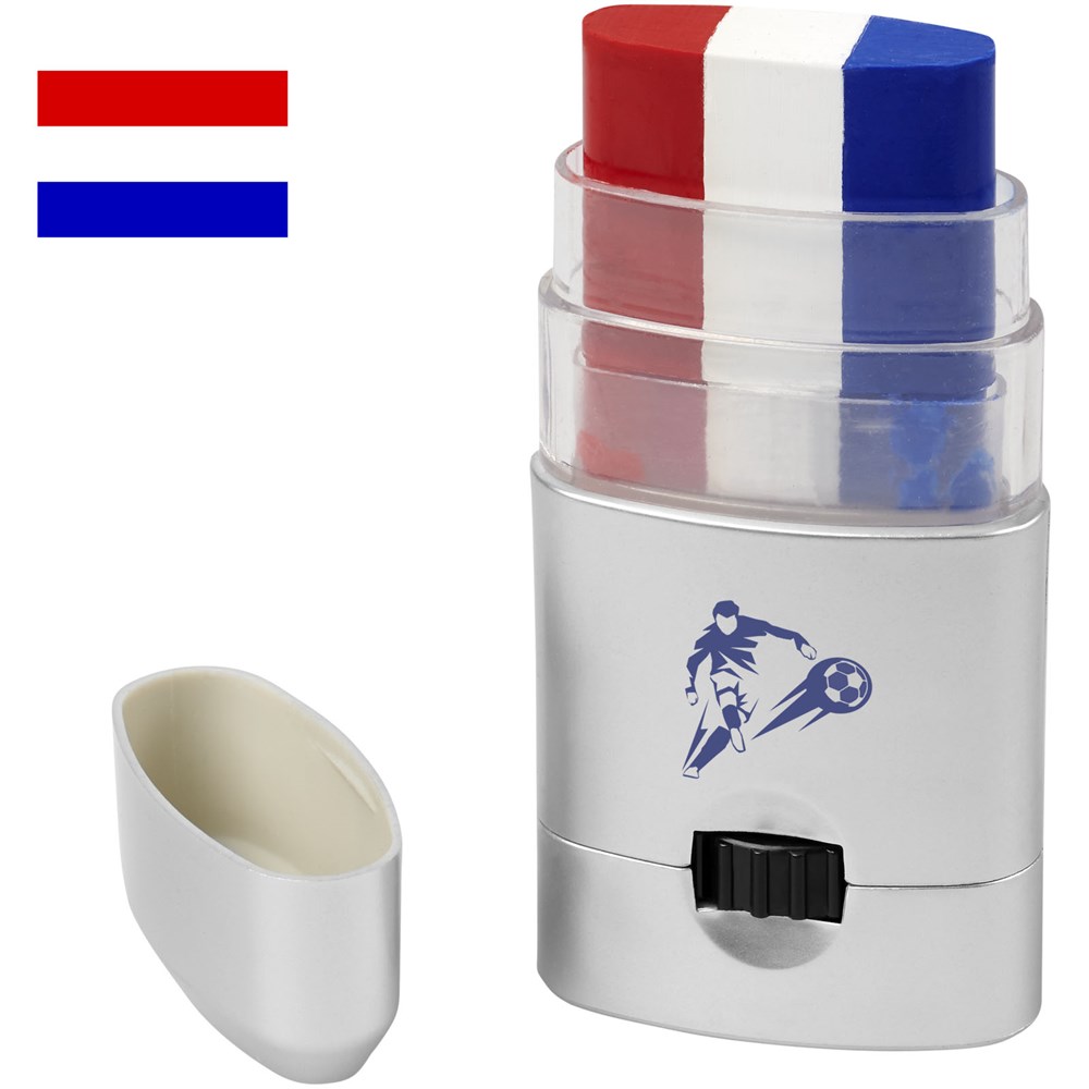 Gemakkelijk te reinigen bodypaint beschikbaar in een breed scala aan kleurencombinaties die de vlaggen van Frankrijk, Duitsland, Italië, Nederland, België, Portugal, Spanje, Oostenrijk, Denemarken, Zwitserland, Zweden en Polen vertegenwoordigen. Kan ook op het gezicht worden aangebracht en kan worden verwijderd met make-upreiniger of met water en zeep. Geproduceerd volgens GMP (Good Manufacturing Practices) nalevingsvereisten en voldoet aan de EU-regelgeving voor cosmetische producten (Verordening (EG) nr. 1223/2009). CPNP registratienummer 3260279.