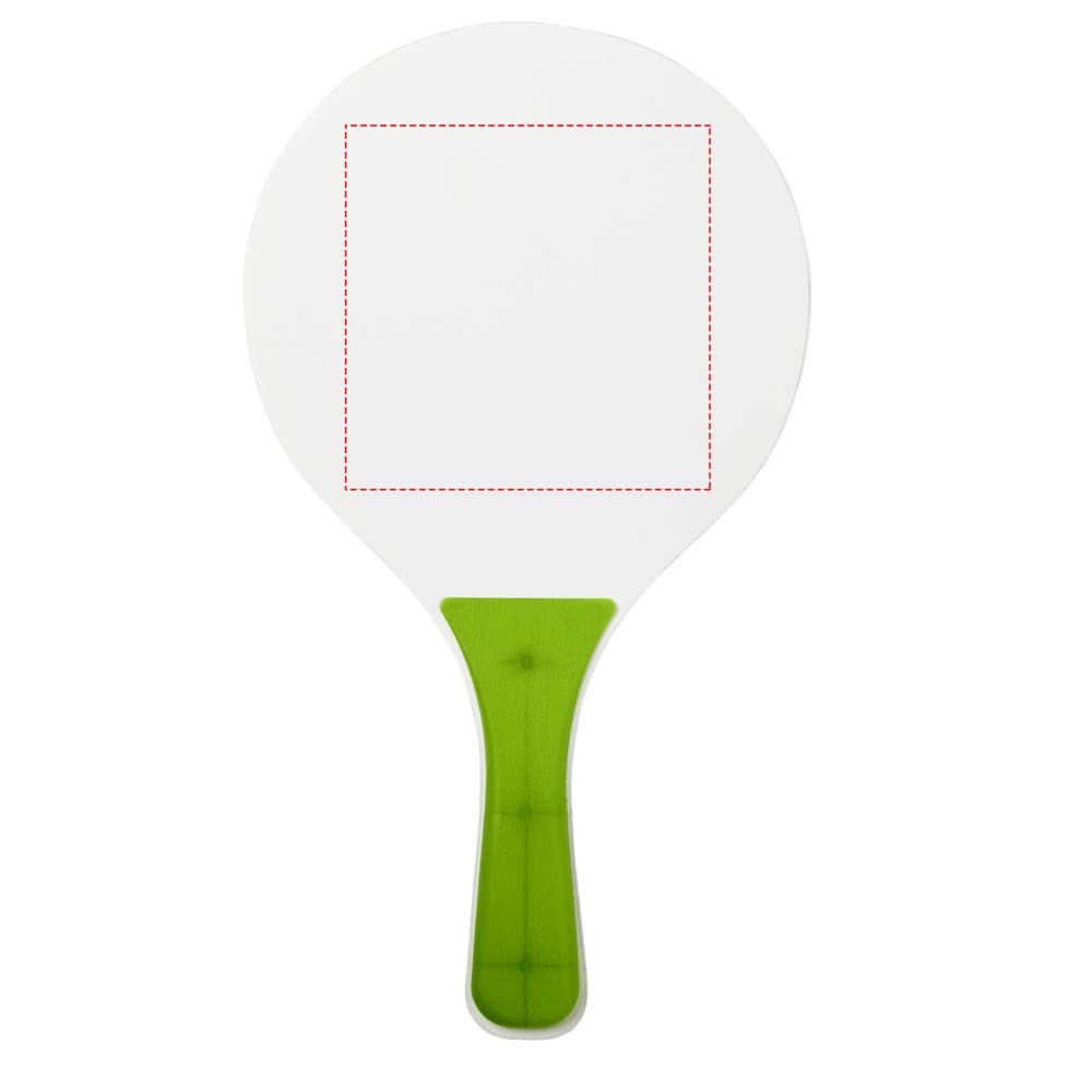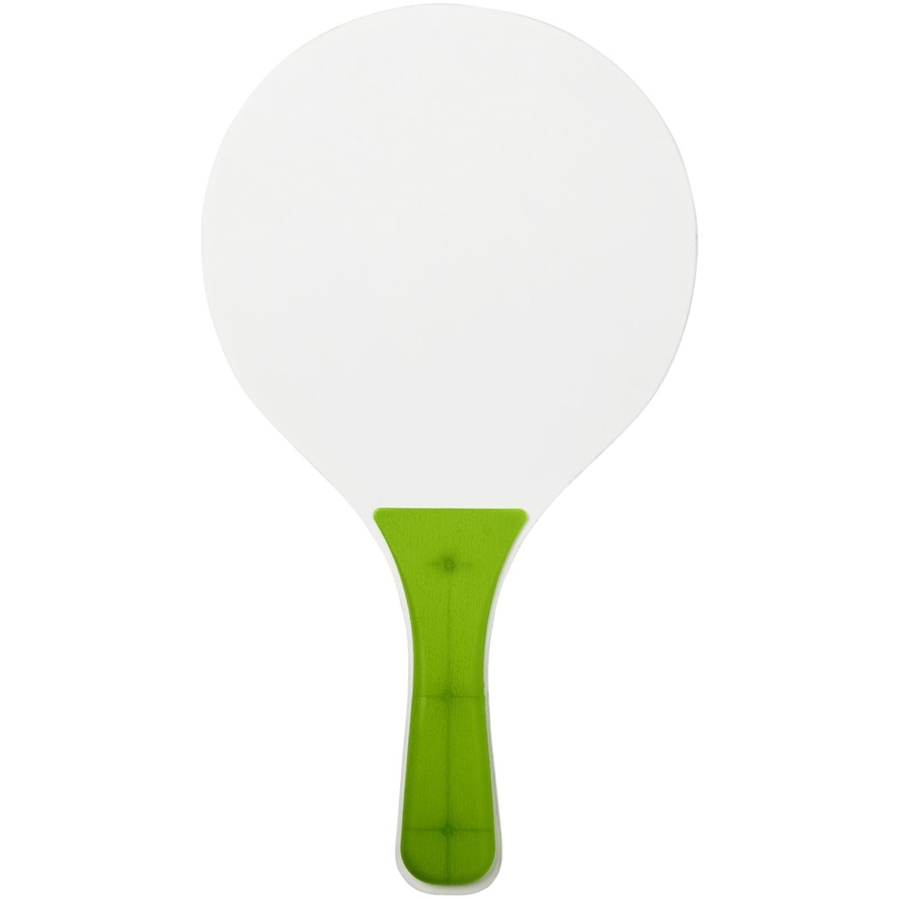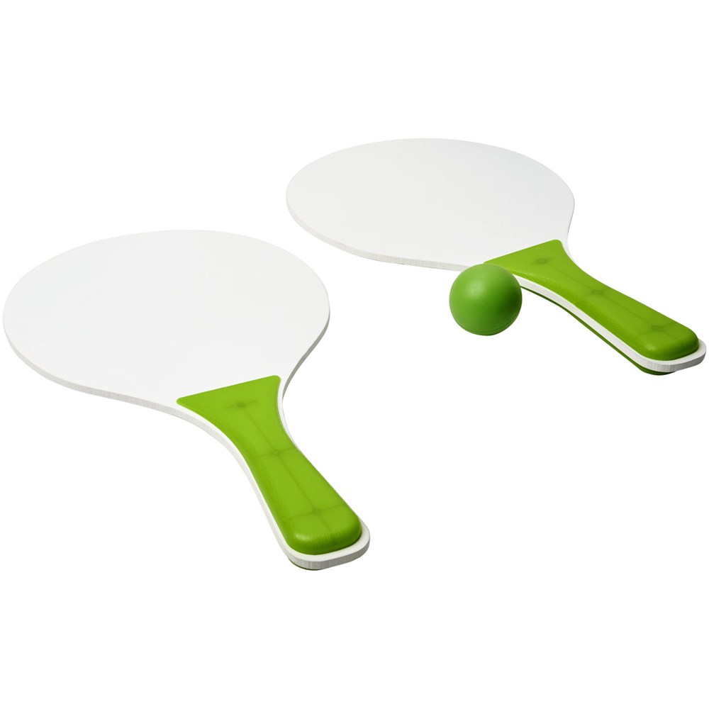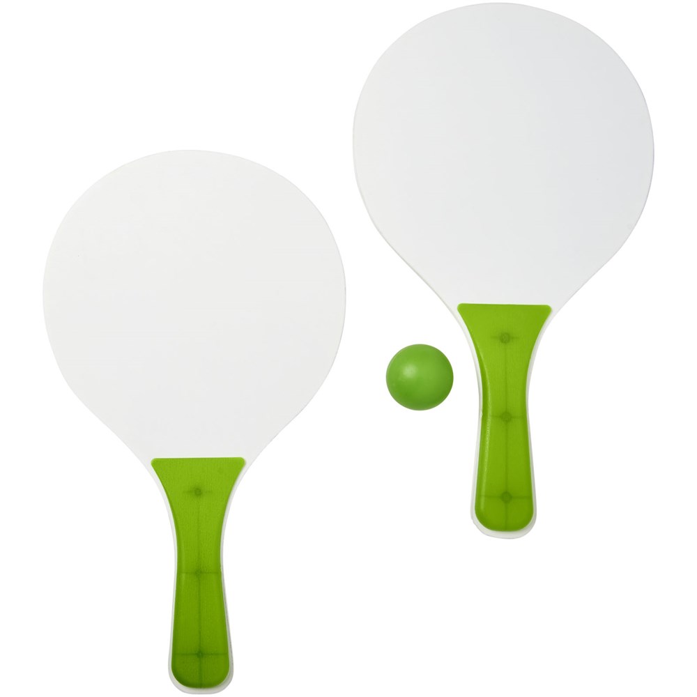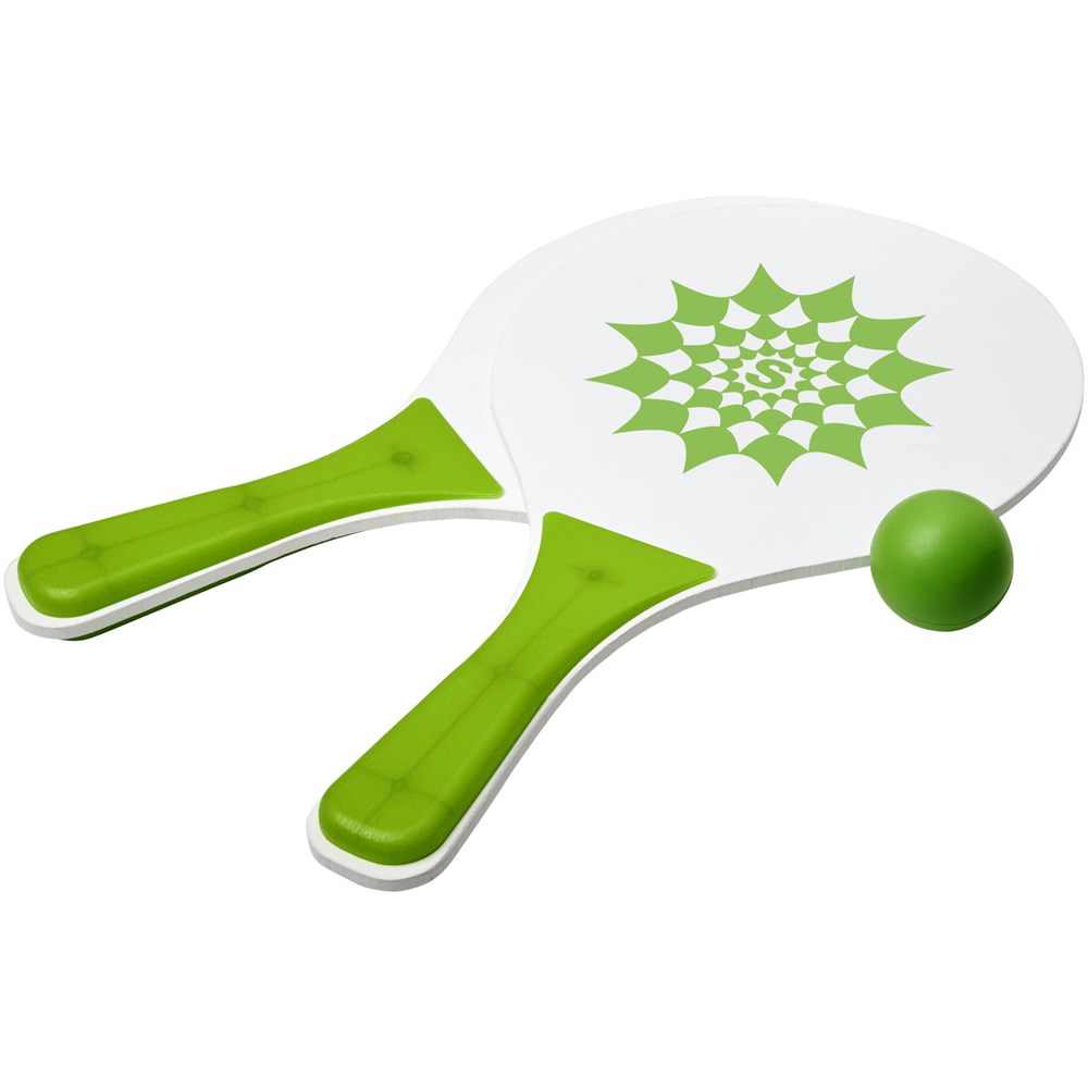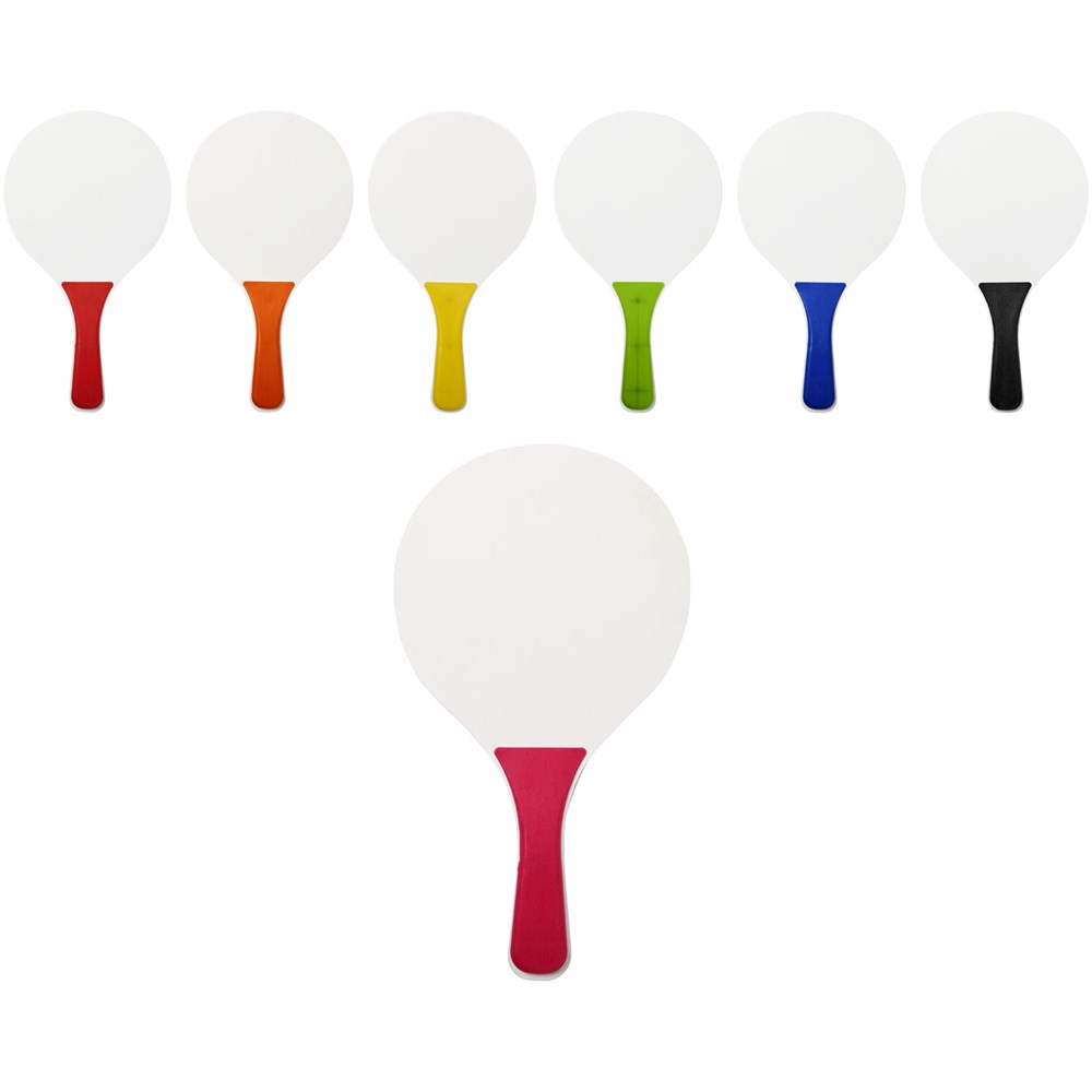 Altijd plezier met deze strandspelset die in de meest diverse kleuren wordt aangeboden. Deze duurzame strandspelset is gemaakt van MDF-hout met gekleurde PP handgreep. Verpakt samen met een zachte bal in een soortgelijke kleur in een netverpakking, waardoor het gemakkelijk is om mee te nemen op een leuke dag naar het strand.