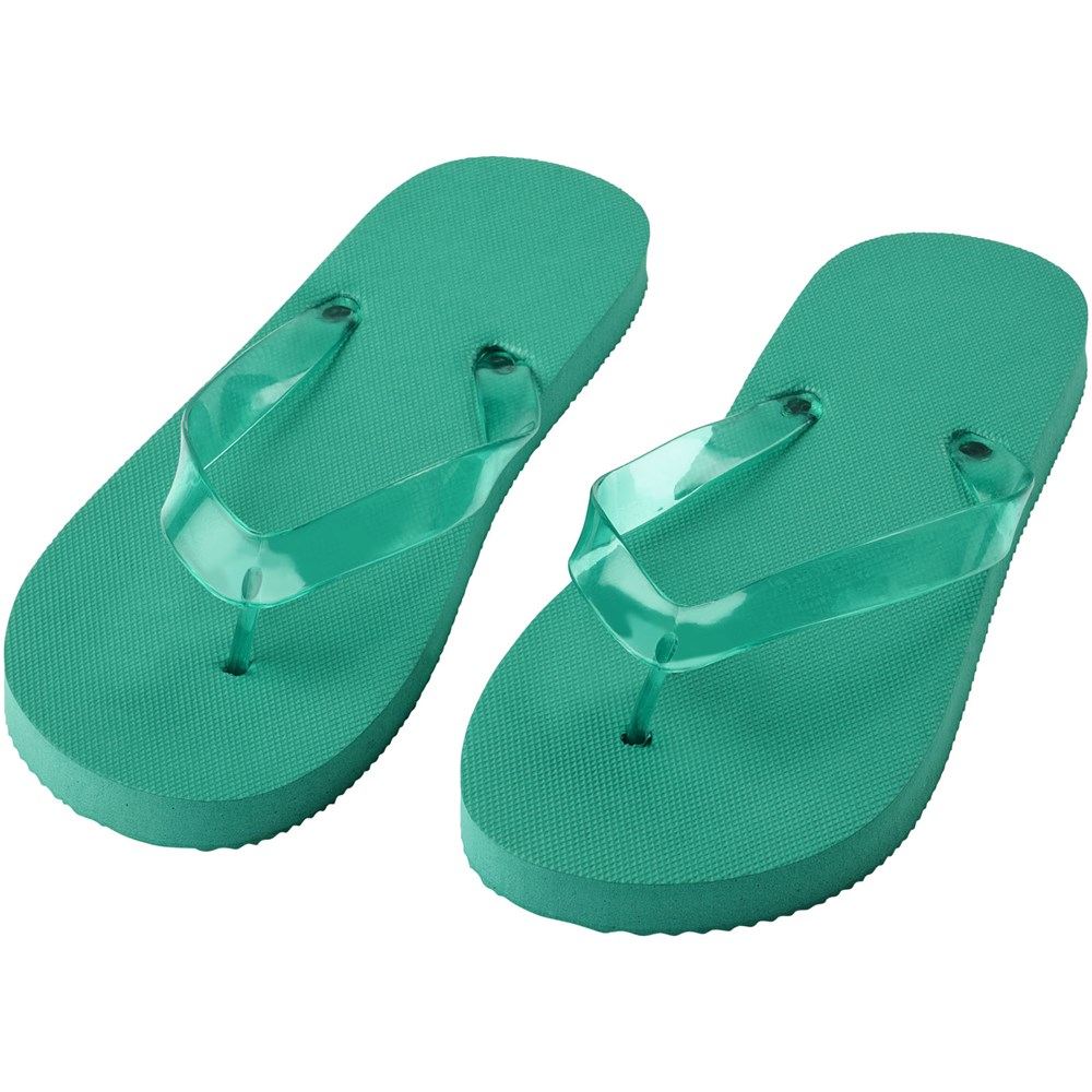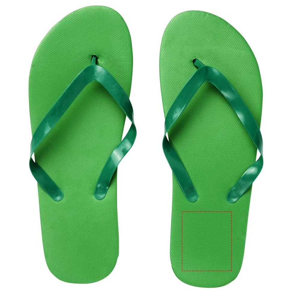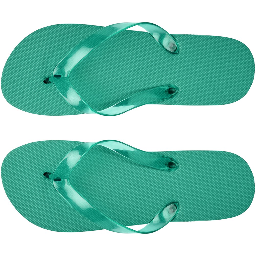 Set comfortabele strandslippers in een breed scala aan kleuren met polyethyleen zool en PVC band. Leverbaar in twee verschillende maten: M 36-38 en L: 42-44. Dit is een bewezen giveaway tijdens het zomerseizoen. Door de aard en het gebruik van dit product staan logo's bloot aan slijtage.